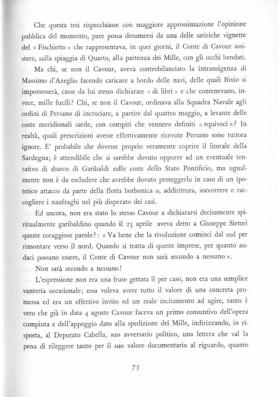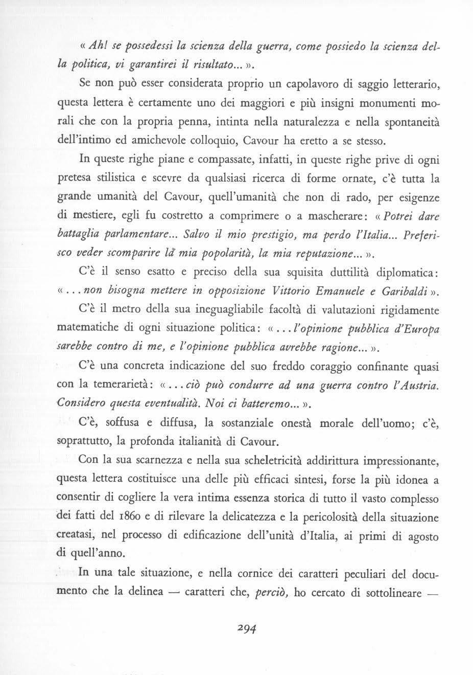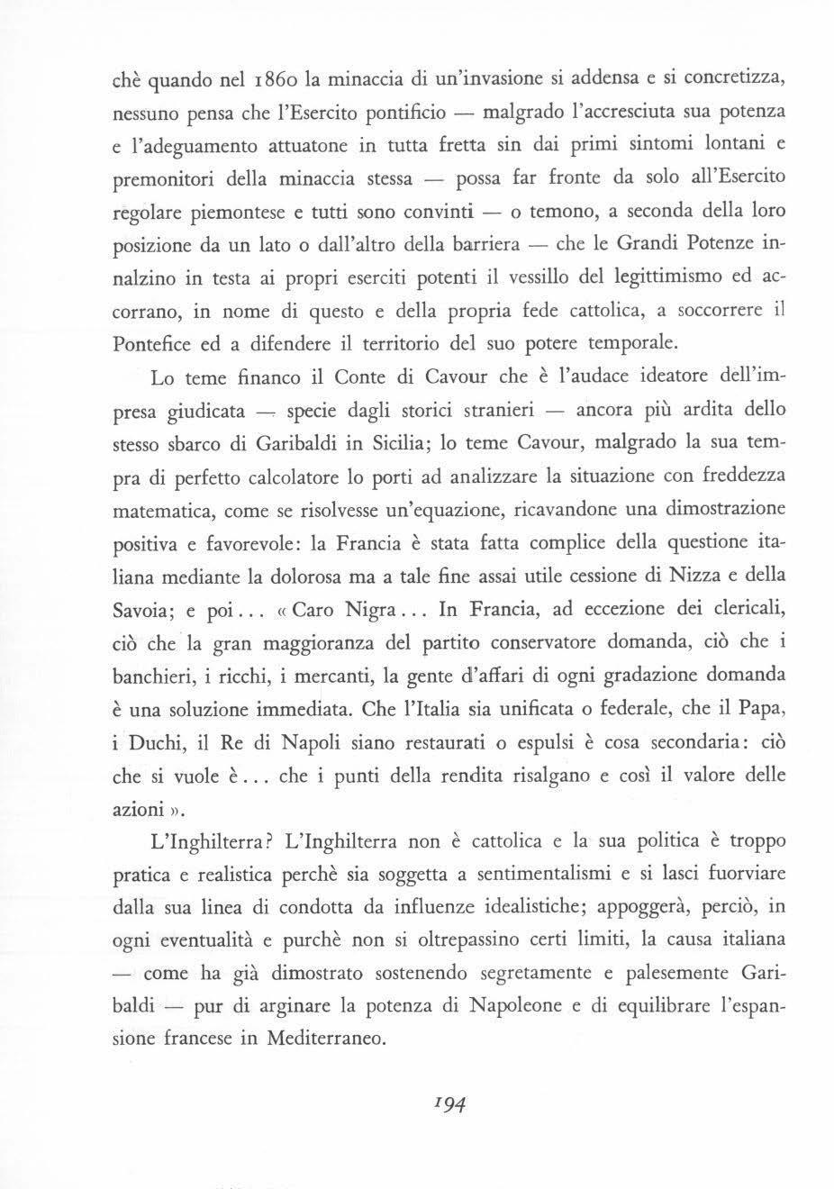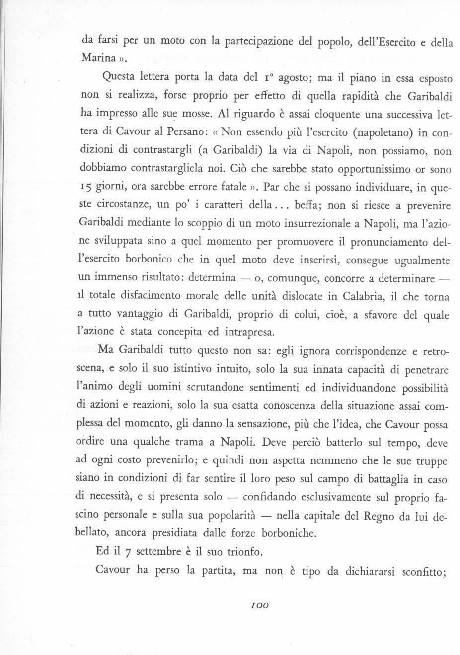 La vasta e complessa situazione generale, fatta di influenze ed interferenze reciproche, intessuta di interessi distinti e disparati alla cui base stava l'odioso ed impopolare atto di cessione di Nizza e della Savoia, aveva creato condizioni ambientali favorevoli ed idonee a quella realizzazione reclamata dallo spirito degli Italiani, imposta dalla coscienza delle masse meridionali, voluta dalla maturità dei tempi; ma in quella stessa situazione Cavour aveva collocato una solida piattaforma che doveva consentirgli di risolvere e concludere in forma dinastica e costituzionale quell'impresa che era sorta come iniziativa garibaldina e rivo) uzionaria.