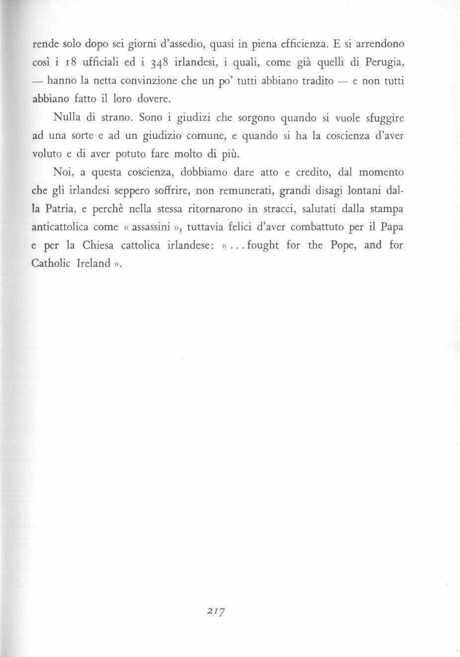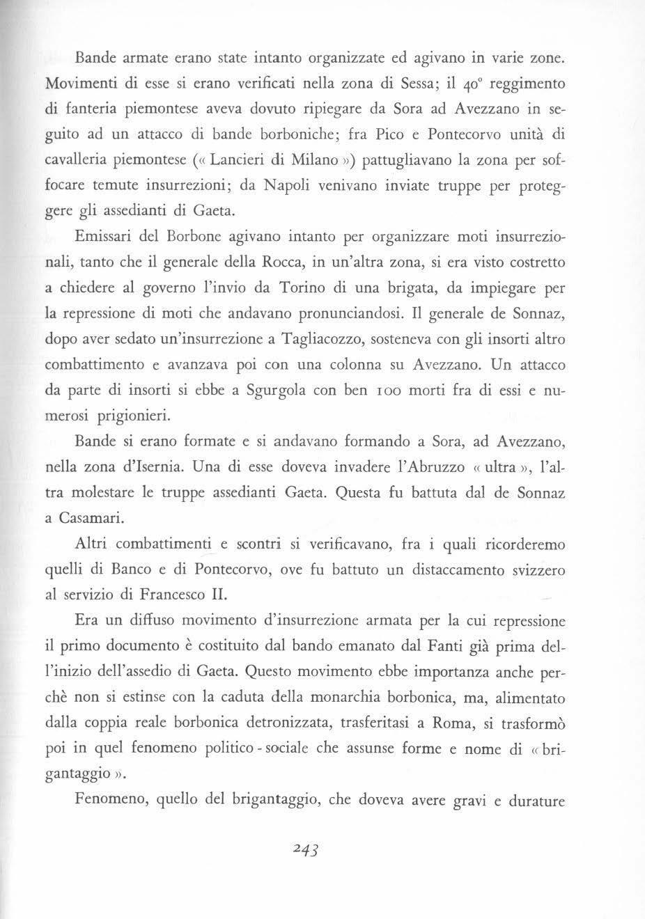 Ma debellato dall'esercito il brigantaggio, insieme al restaurato imperio della legge nel Mezzogiorno, venivano alfine ristabilite anche le elementari condizioni di ordine interno che costituivano per quelle popolazioni il presupposto stesso del vivere civile. In questo senso l'esercito aveva operato pe; un ideale più largamente e universalmente umano e da questo suo ufficio esercitato a tutela della vita, dei beni e della tranquillità di tutti i cittadini attingeva sempre maggior consapevolezza della sua civica funzione.