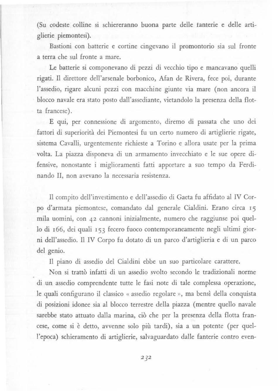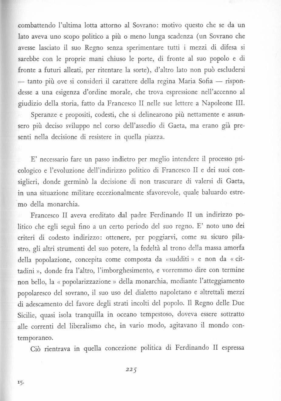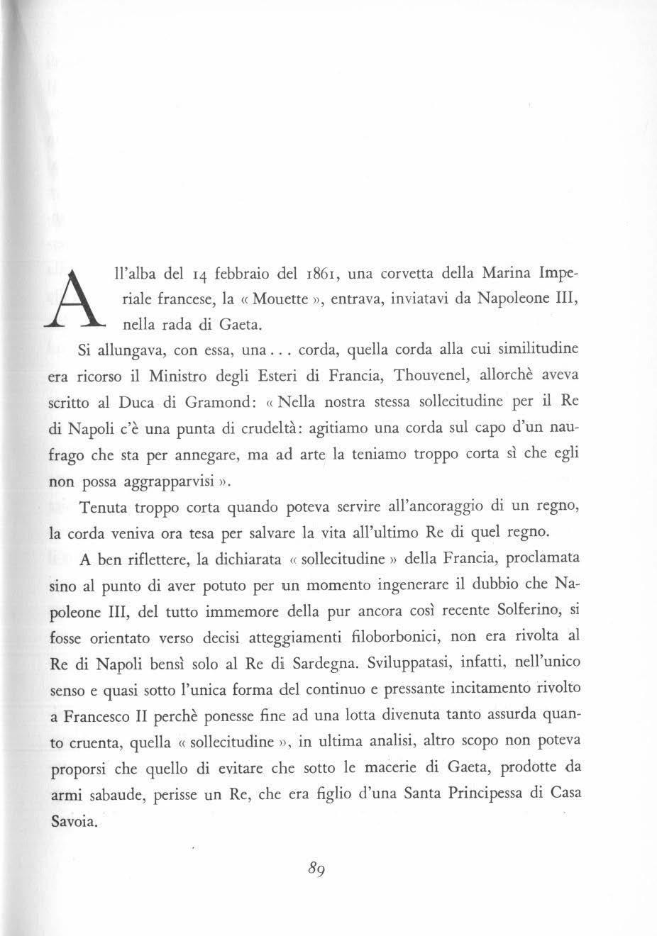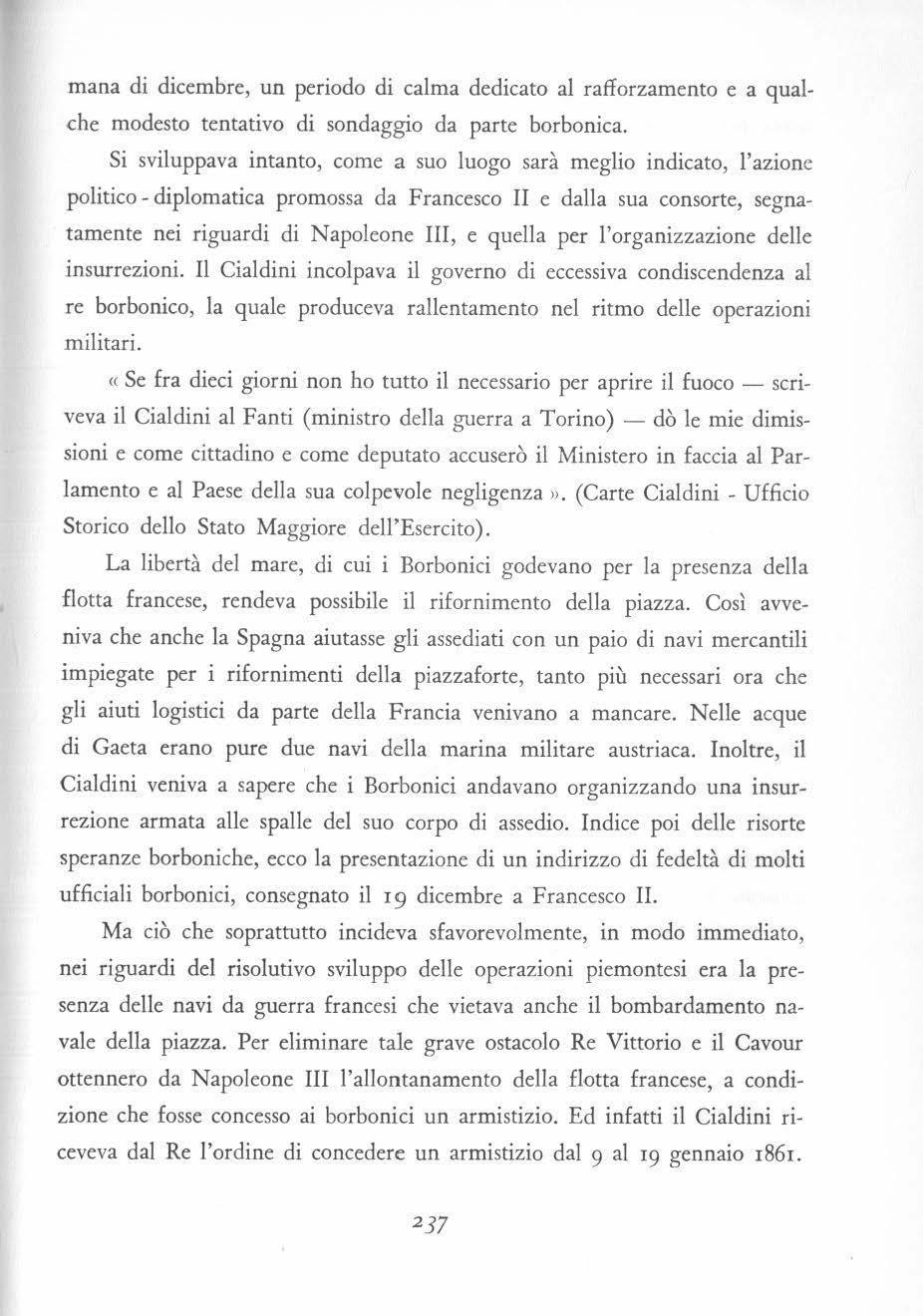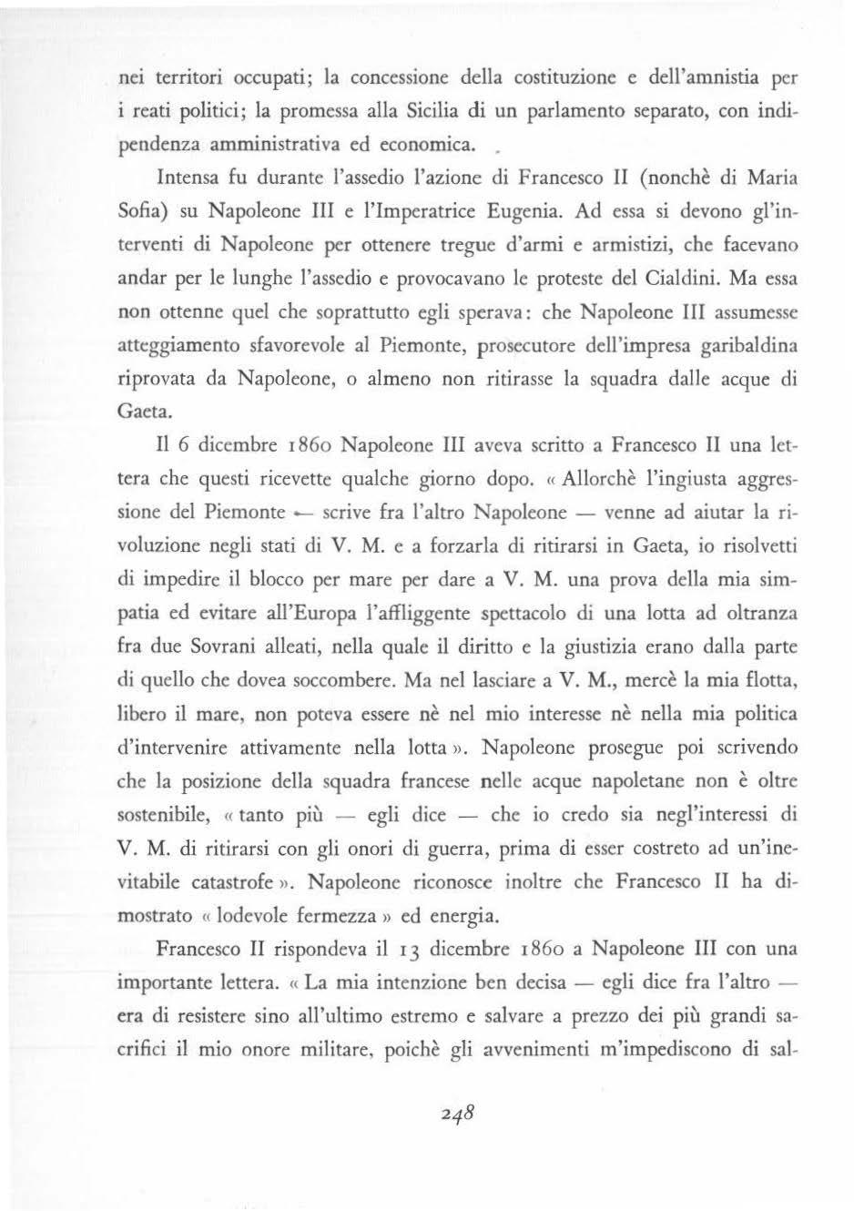 A Gaeta infatti le superstiti forze borboniche, benchè forti della ritrovata disciplina e fedeltà, combattevano una cavalleresca battaglia senza speranza; ed era chiaro che quella strenua e, per molti aspetti, invero romantica difesa di prodi soldati serrati intorno al loro re non aveva ormai alcun significato se non di tener fede all'onor militare; ma non avrebbe per altro potuto sortire alcun pratico effetto, salvo quello - del pari nobile, ma meramente ideale - di protesta al cospetto dell'Europa per il diritto dinastico offeso dall'eversione rivoluzionaria.
