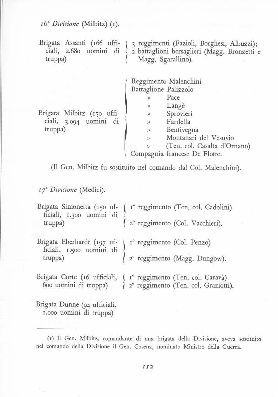 Per quanto riguarda la truppa dell'esercito borbonico, il problema fu risolto con relativa facilità. Con decreto del 17 dicembre r86o si estese anche alle province dell'ex Regno delle Due Sicilie l'applicabilità dell'articolo 82 dello Statuto albertino e, per ciò stesso, quelle popolazioni furono sottoposte alla legislazione sul servizio militare obbligatorio, compresi quindi gli ex soldati borbonici che dovevano ancora completare il servizio di leva.