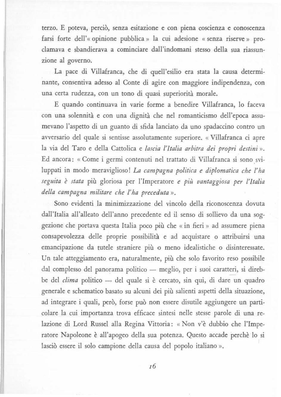 Il 25 gennaio il Conte di Cavour, da soli cinque giorni tornato al potere, scriveva al Principe Napoleone: << • • • benedetta sia la pace di Villafranca ! « Senza di essa la questione romana, la più importante di tutte non solamente per l'Italia ma per la Francia e l'Europa, non avrebbe potuto ricevere una soluzione completa, sanzionata senza riserve dall'opinione pubblica » .