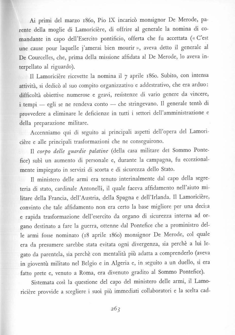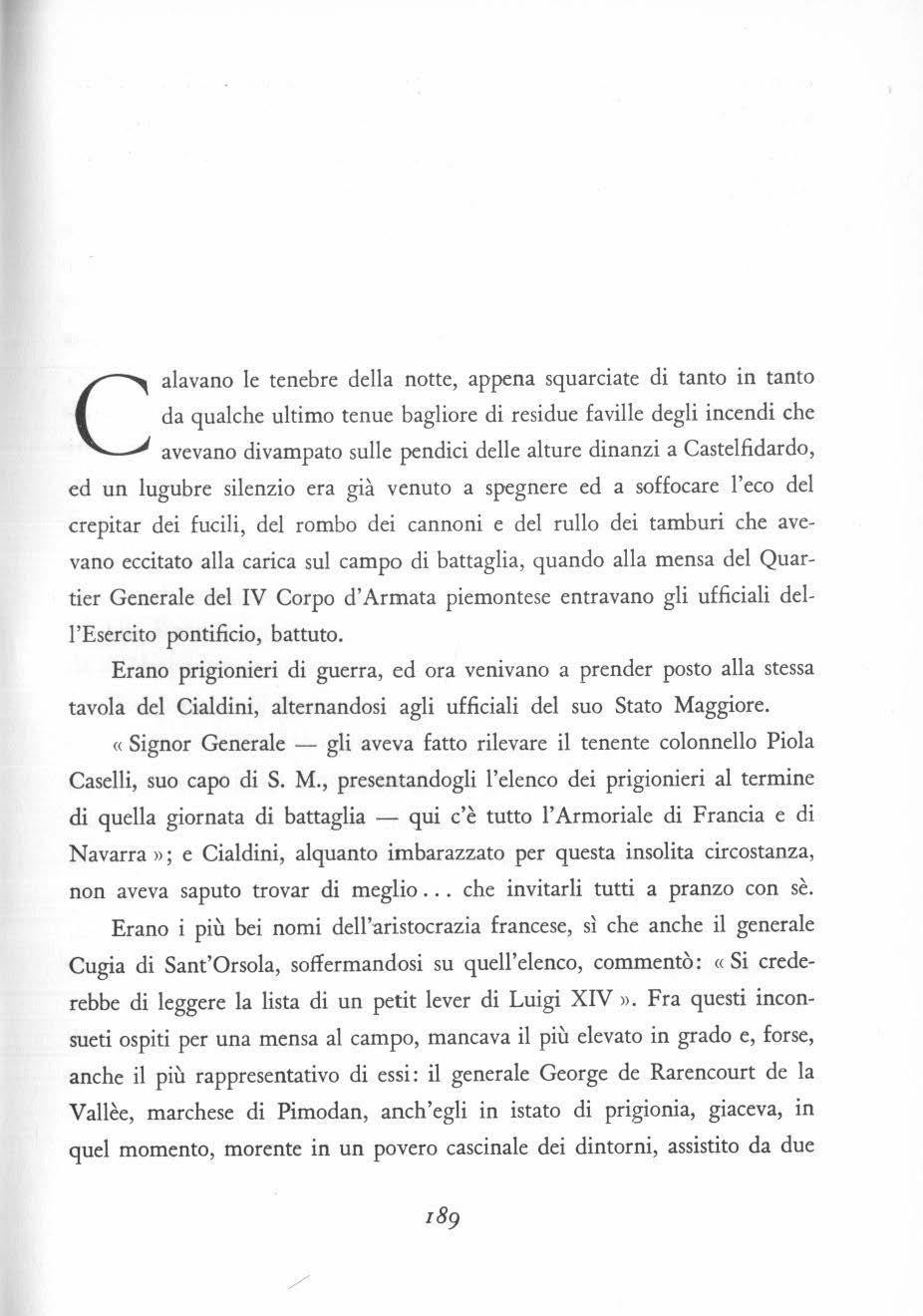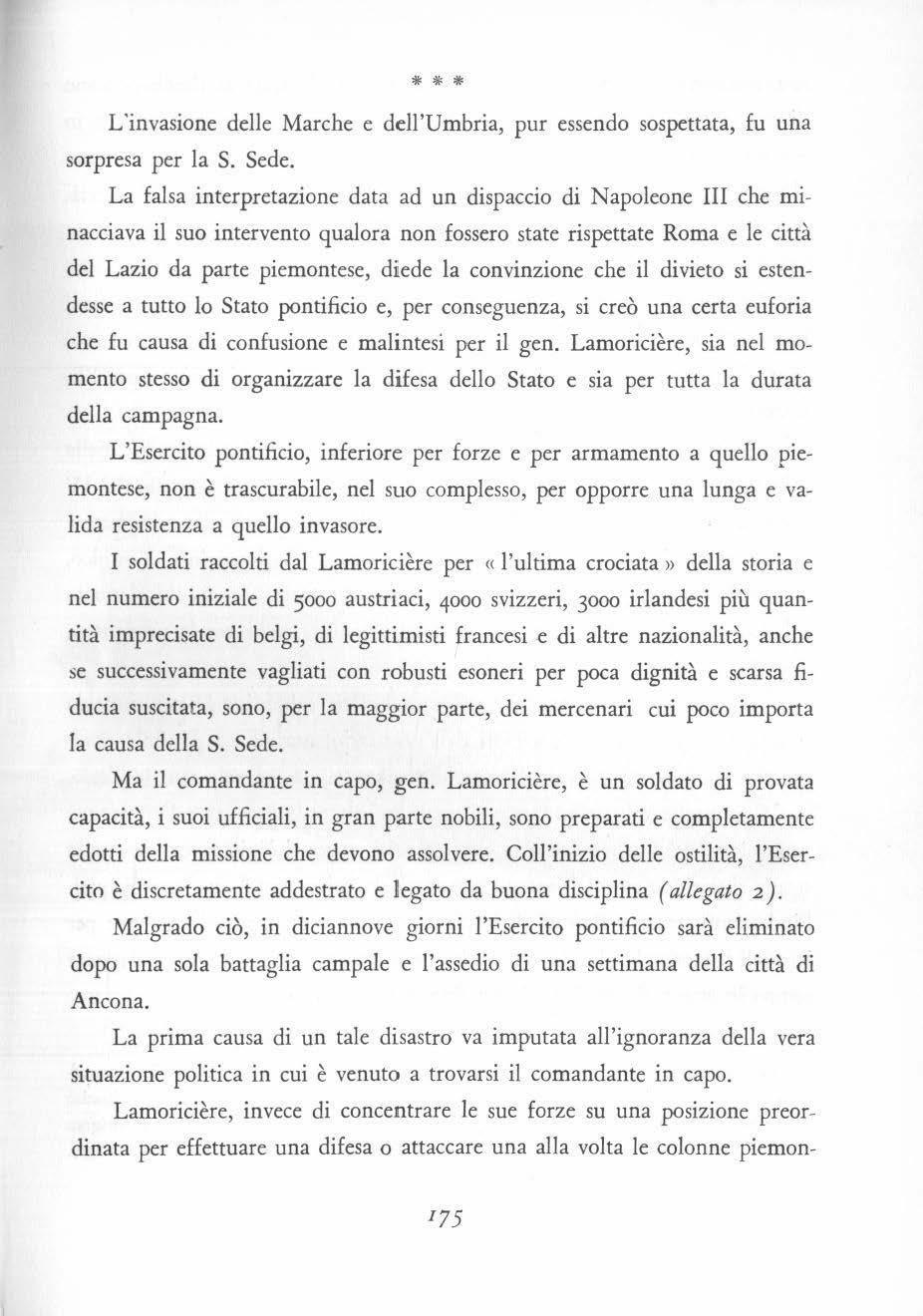 Giacchè se è vero che lo stesso Napoleone III con il suo ricordato « allez et faites vite )> aveva dato mano libera all'invasione delle terre pontificie ( e quest'autorizzazione avrebbe potuto costituire anche da sola un sostanziale vantaggio conseguito da quella cessione) e se è anche vero che le truppe pontificie non si identificavano affatto con l'Esercito francese, è altrettanto vero che esse erano agli ordini di un generale francese e che in esse militavano i più bei nomi di Francia sì che il generale Cugia, scorrendo una lista di prigionieri dopo Caste!fìdardo ebbe ad esclamare: « Si crederebbe di leggere la lista di un petit lever di Luigi XIV > l