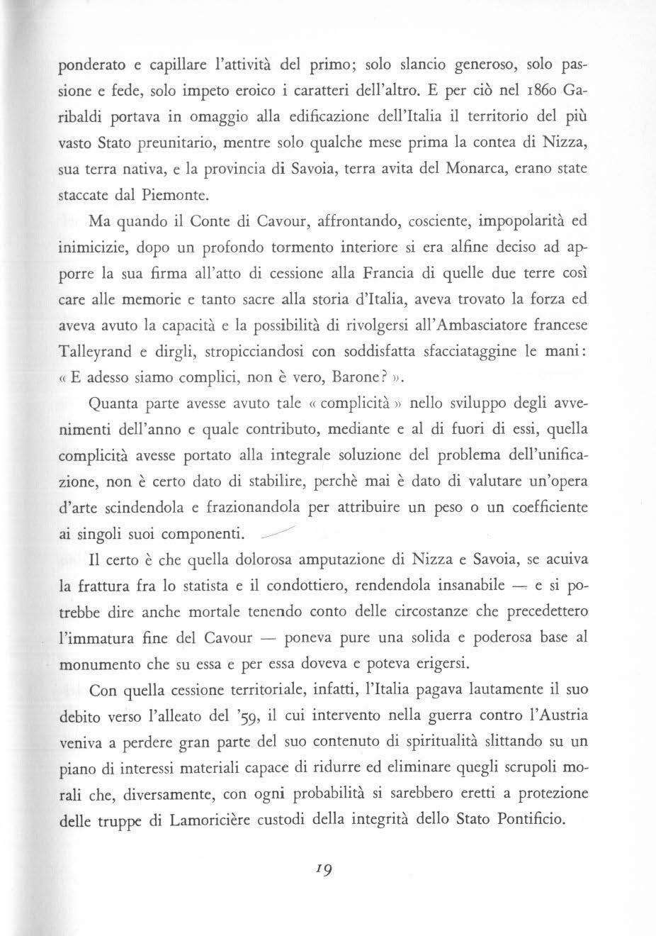Ma quando il Conte di Cavour, affrontando, cosciente, impopolarità ed inimicizie, dopo un profondo tormento interiore si era alfine deciso ad apporre la sua .firma all ' atto di cessione alla Francia di quelle due terre così care alle memorie e tanto sacre alla storia d'Italia, aveva trovato la forza ed aveva avuto la capacità e la possibilità di rivolgersi all'Ambasciatore francese Talleyrand e dirgli, stropicciandosi con soddisfatta sfacciataggine le mani: « E adesso siamo complici, non è vero, Barone ? )>