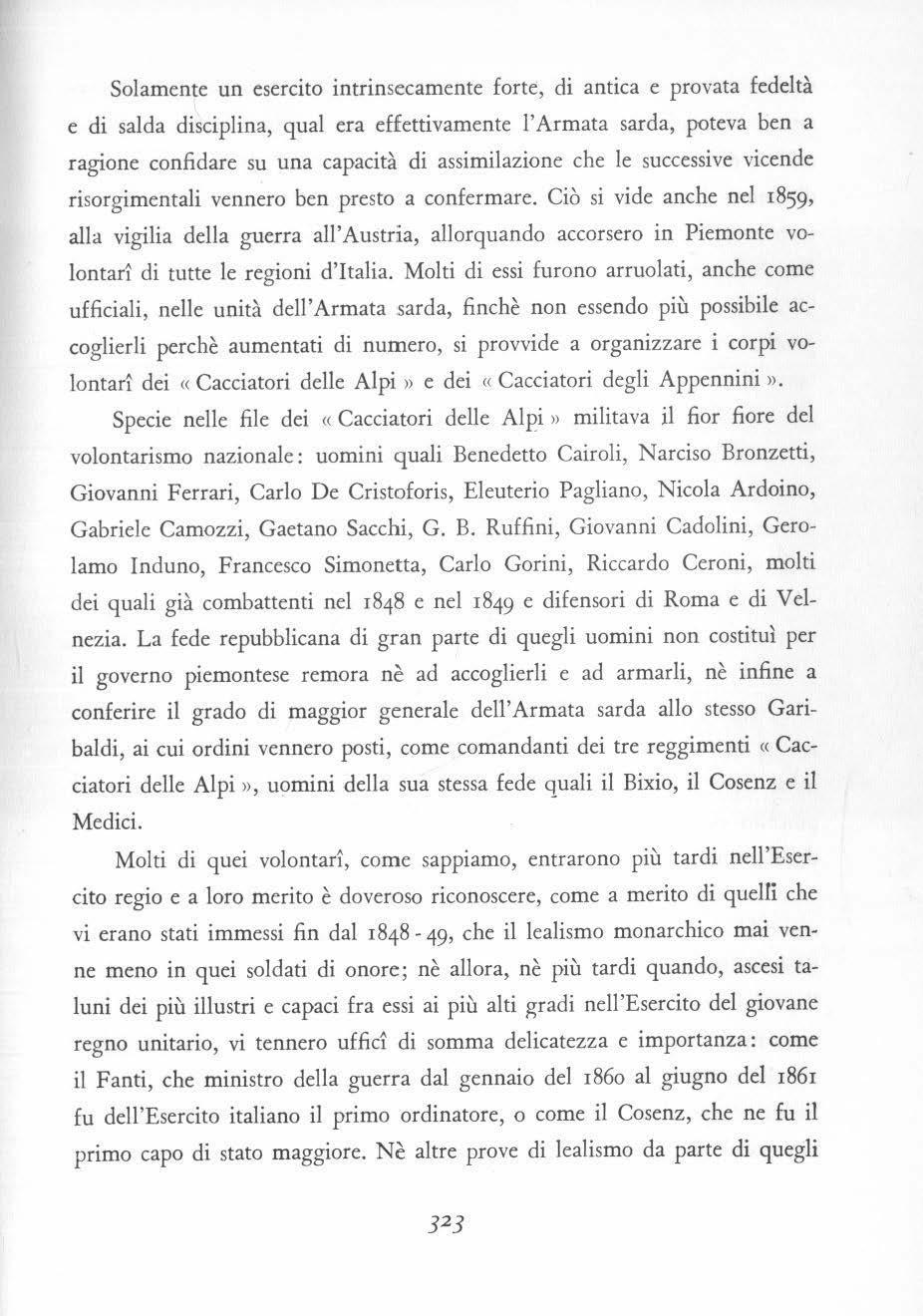 Molti di quei volontad, come sappiamo, entrarono più tardi nell'Esercito regio e a loro merito è doveroso riconoscere, come a merito di que!Ii che vi erano stati immessi fin dal 1848 - 49, che il lealismo monarchico mai venne meno in quei soldati di onore; nè allora, nè più tardi quando, ascesi taluni dei più illustri e capaci fra essi ai più alti gradi nell'Esercito del giovane regno unitario, vi tennero uffid di somma delicatezza e importanza: come il Fanti, che ministro della guerra dal gennaio del 1860 al giugno del 1861 fu dell'Esercito italiano il primo ordinatore, o come il Cosenz, che ne fu il primo capo di stato maggiore. Nè altre prove di lealismo da parte di quegli