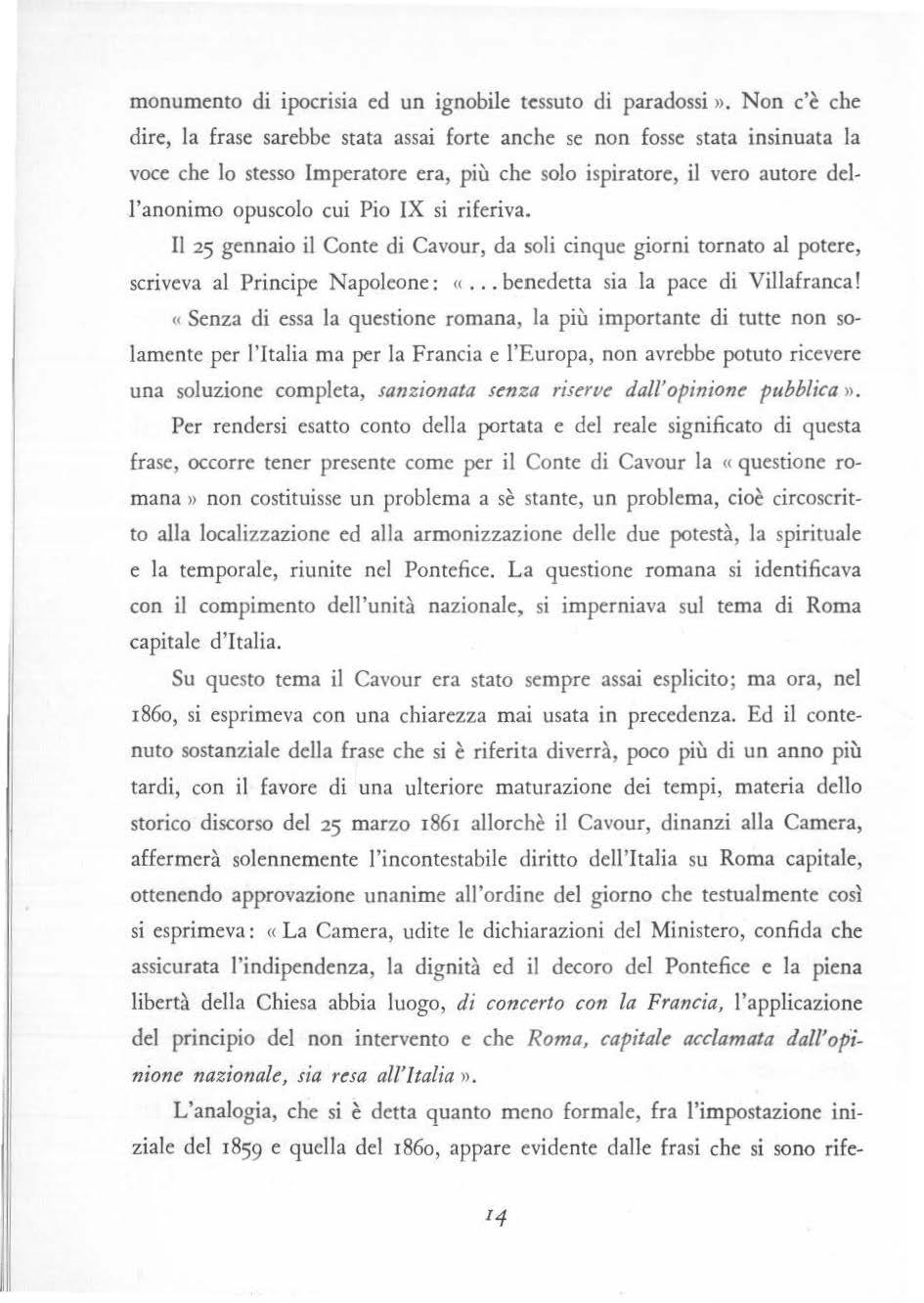 Per rendersi esatto conto della partata e del reale significato di questa frase, occorre tener presente come per il Conte di Cavour la « questione romana » non costituisse un problema a sè stante, un problema, cioè circoscritto alla localizzazione ed alla armonizzazione delle due potestà, la spirituale e la temporale, riunite nel Pontefice. La questione romana si identificava con il compimento dell'unità na zionale, si imperniava sul tema di Roma capitale d'Italia.