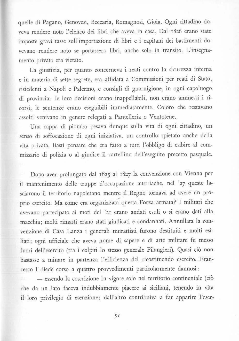 Le critiche, dunque, invero aspre ed assai severe mosse ai Generali bor• bonici, non sono riuscite che a dichiarare colpe, difetti e torti del tutto individuali e personali, senza pervenire ad individuare quei caratteri, anche se negativi, comuni, estesi, generalizzati. Tutto questo, forse, è di estrema logicità, in quanto, a ben riflettere, nel Regno delle Due Sicilie una vera e propria classe militare non esisteva o, meglio, si era estinta per inaridimento. C'era stato, con Ferdinando II, un fenomeno di imborghesimento, le cui cause o la cui necessità non giova qui indagare. Ed i difetti dei singoli non