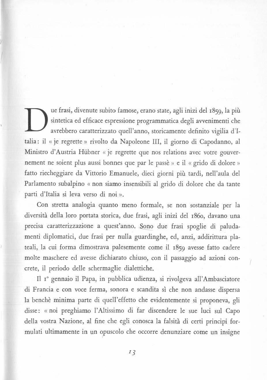 Due frasi, divenute subito famose, erano state, agli inizi del 1859, la più sintetica ed efficace espressione programmatica degli avvenimenti che avrebbero caratterizzato quell'anno, storicamente de.finito vigilia d'Italia: il « je regrette >> rivolto da Napoleone III, il giorno di Capodanno, al Ministro d'Austria Hiibner « je regrette que nos relations avec votre gouvernement ne soient plus aussi bonnes que par le passè » e il « grido di dolore >> fatto riecheggiare da Vittorio Emanuele, dieci giorni più tardi, nell'aula del Parlamento subalpino « non siamo insensibili al grido di dolore che da tante parti d'Italia si leva verso di noi».