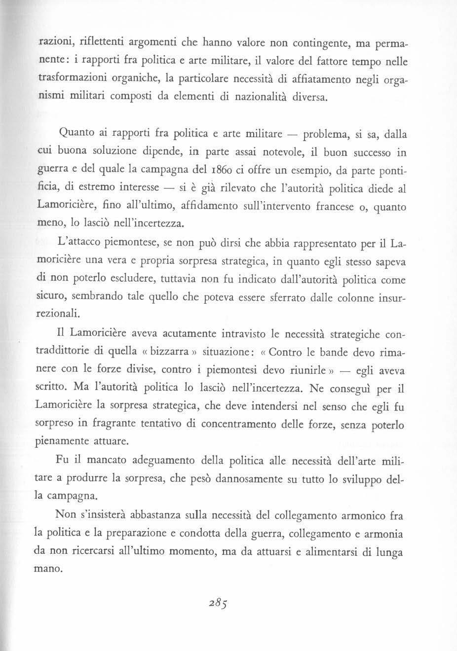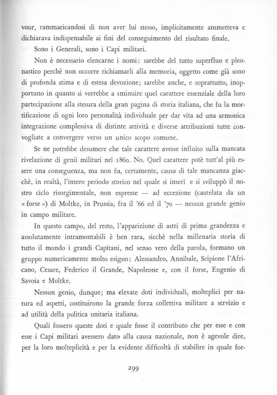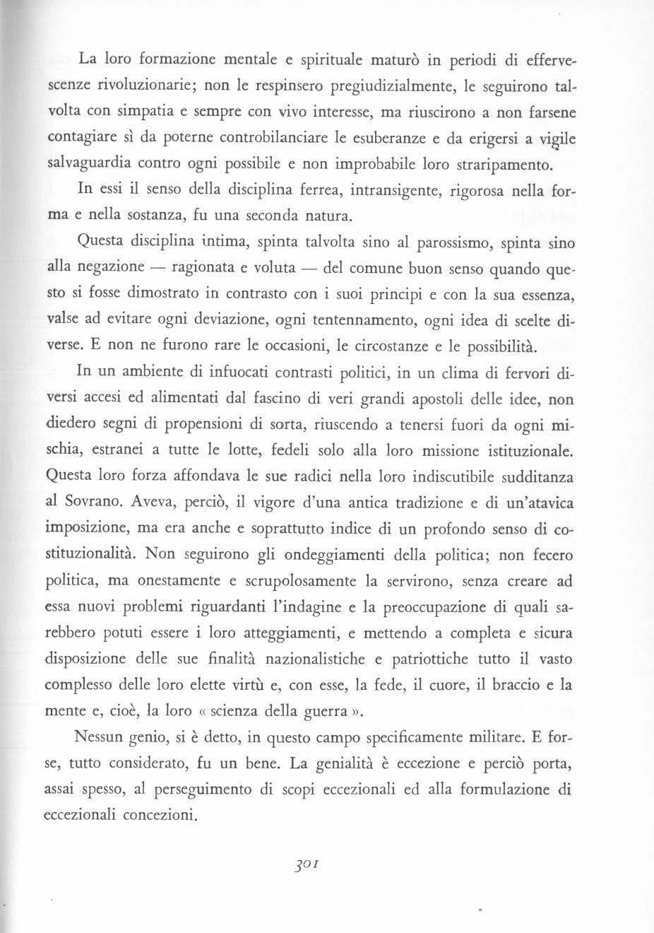 E certamente, privo di qllella saldezza morale che traeva la sua forza proprio da quei valori, il giovane esercito nazionale non avrebbe potuto validamente far fronte a una situazione grave e delicata come quella davanti alla quale fu posto nel momento stesso in cui nasceva lo Stato unitario. Poichè era chiaro che il nuovo ordine nazionale avrebbe potuto sopravvivere e consolidarsi solo a patto di assicurare la stabilità interna e la difesa; e a quest'opera altamente impegnativa doveva attendere anzitutto l'esercito, assolvendo anche la funzione di elemento di fusione spirituale, prima ancora che materiale, fra le varie regioni della nuova Italia e fra gli stessi ceti sociali.