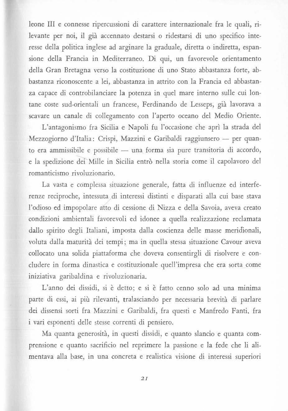 leone III e connesse ripercussioni di carattere internazionale fra le quali, rilevante per noi, il già accennato destarsi o ridestarsi di uno specifico interesse della politica inglese ad arginare la graduale, diretta o indiretta, espansione della Francia in Mediterraneo. Di qui, un favorevole orientamento della Gran Bretagna verso la costituzione di uno Stato abbastanza forte, abbastanza riconoscente a lei, abbastanza in attrito con la Francia ed abbastanza capace di controbilanciare la potenza in quel mare interno sulle cui lontane coste sud-orientali un francese, Ferdinando de Lesseps, già lavorava a scavare un canale di collegamento con l'aperto oceano del Medio Oriente. L'antagonismo fra Sicilia e Napoli fu l'occasione che aprì la strada del Mezzogiorno d'Italia: Crispi, Mazzini e Garibaldi raggiunsero - per quanto era ammissibile e possibile - una forma sia pure transitoria di accordo, e la spedizione deì Mille in Sicilia entrò nella storia come il capolavoro del romanticismo rivoluzionario.