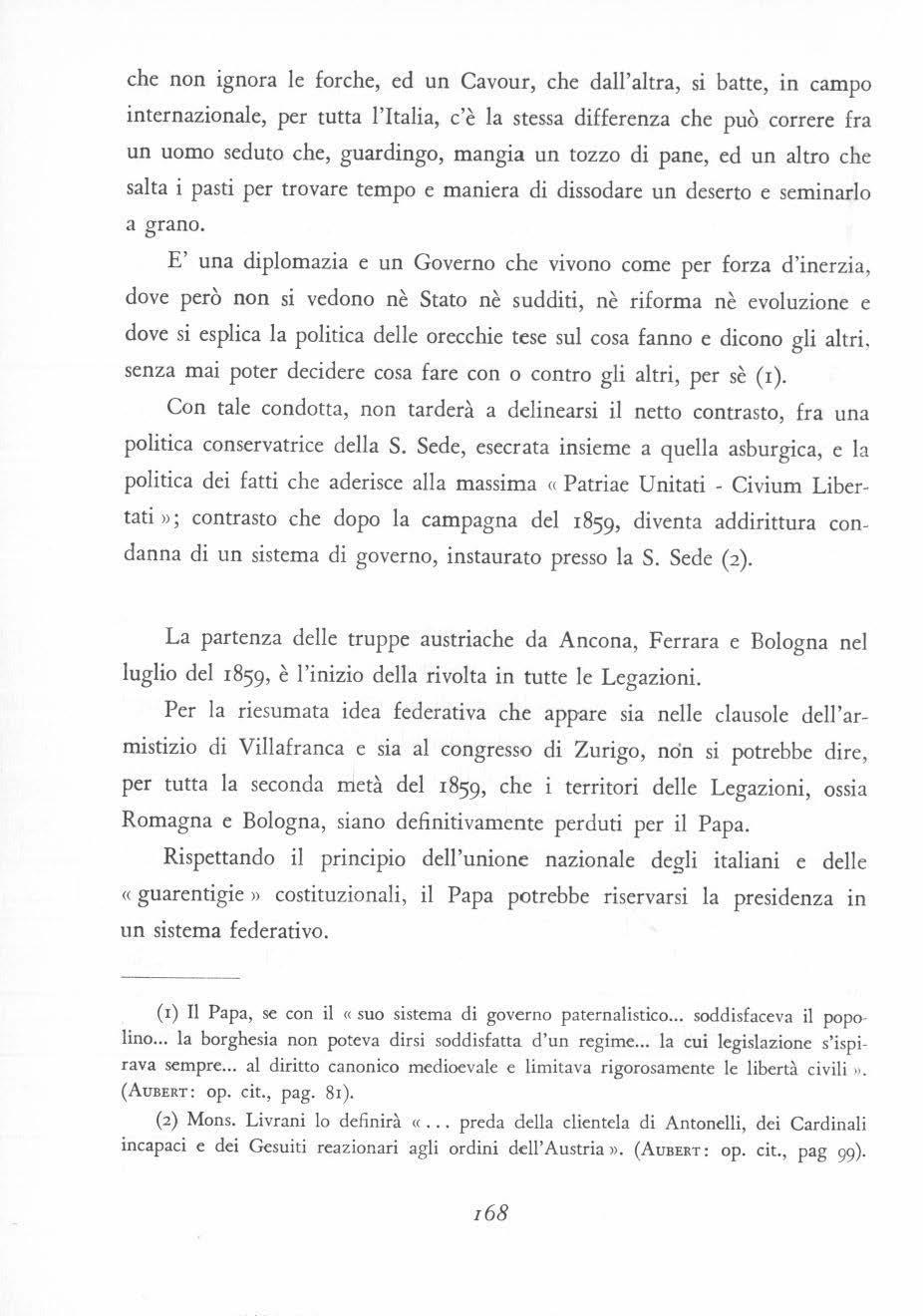 Su questo tema il Cavour era stato sempre assai esplicito; ma ora, nel 1860, si esprimeva con una chiarezza mai usata in precedenza. Ed il contenuto sostanziale della frase che si è riferita diverrà, poco più di un anno più tardi, con il favore di una ulteriore maturazione dei tempi, materia dello storico discorso del 25 marzo 1861 allorchè il Cavour, dinanzi alla Camera, affermerà solennemente l'incontestabile diritto dell'Italia su Roma capitale, ottenendo approvazione unanime all'ordine del giorno che testualmente così si esprimeva: « La Camera, udite le dichiarazioni del Ministero, confida che assicurata l 'in dipendenza, la dignità ed il decoro del Pontefice e la piena libertà della Chiesa abbia luogo, di concerto con la Francia, l'applicazione del principio del non intervento e che Roma, capitale acclamata dal!'opinione nazionale, sia resa all'Italia».