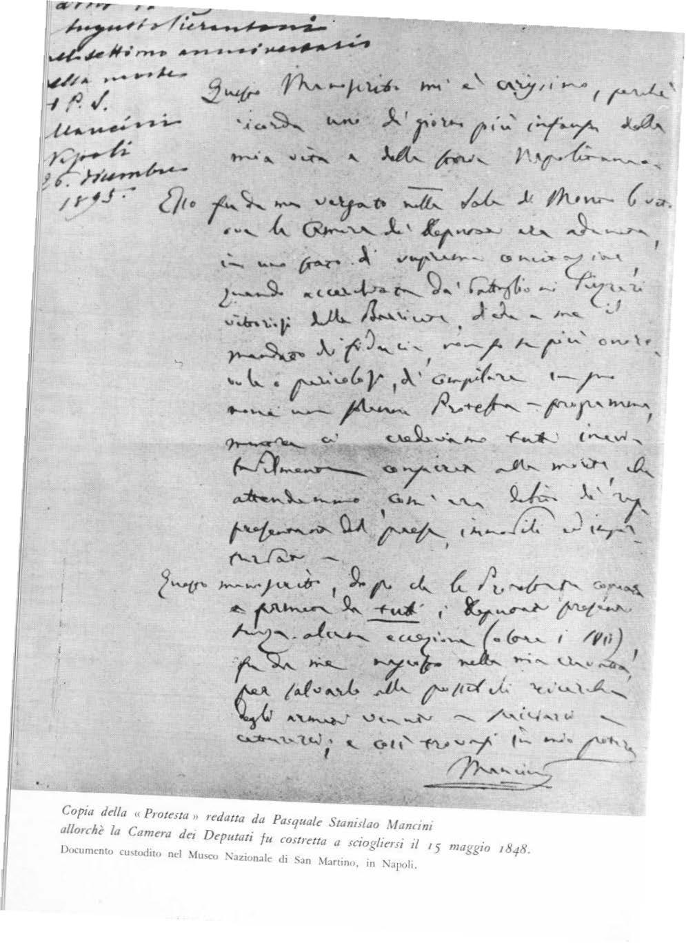 Copia della "Protesta" redatta da Pasqua le St anislao Mancini lorchè la Camera dei Deputati fu costretta a sciogliersi il maggio 1848