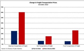 The price of truck, rail, and ocean transportation of freight each decreased in October. Trucking freight prices fell 1.4%–the fifth consecutive decline—while the indexes for rail and deep sea transportation of freight decreased 0.7% and 1.8%, respectively. Year-to-date, the prices of ocean, rail, and truck freight transportation have increased 25.2%, 6.5%, and 6.0%.