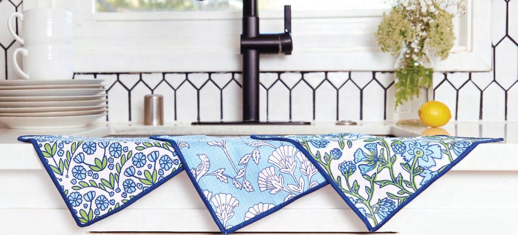 Our best-selling microfiber tea towels just keep getting better! New designs have a coordinating print on each side making them like two towels in one. These highperformance towels are crafted from recycled plastic bottles that are transformed into a soft waffle weave microfiber fabric. Eco-conscious and totally giftable, your customers will keep coming back for more!