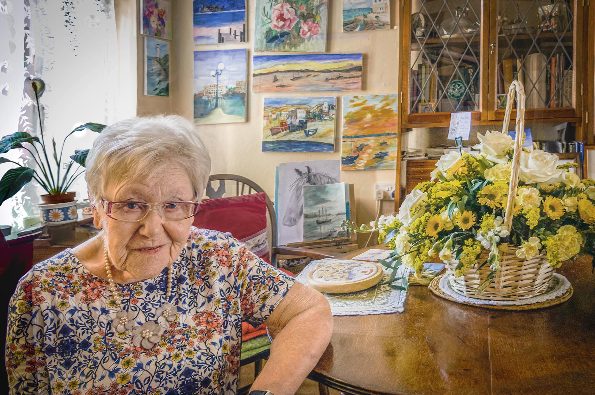 My favourite photo is the one of my mother taken on her 100th birthday. She was sitting with her back to her many oil and watercolour paintings, with a bouquet of flowers on a table alongside, a record of her many interests. I happened to glance up to see a wry smile on my mother’s face. I did not notice at first, the card on the table. I had caught my mother trying to imitate the pose of The Queen on her 100th year Birthday card.
