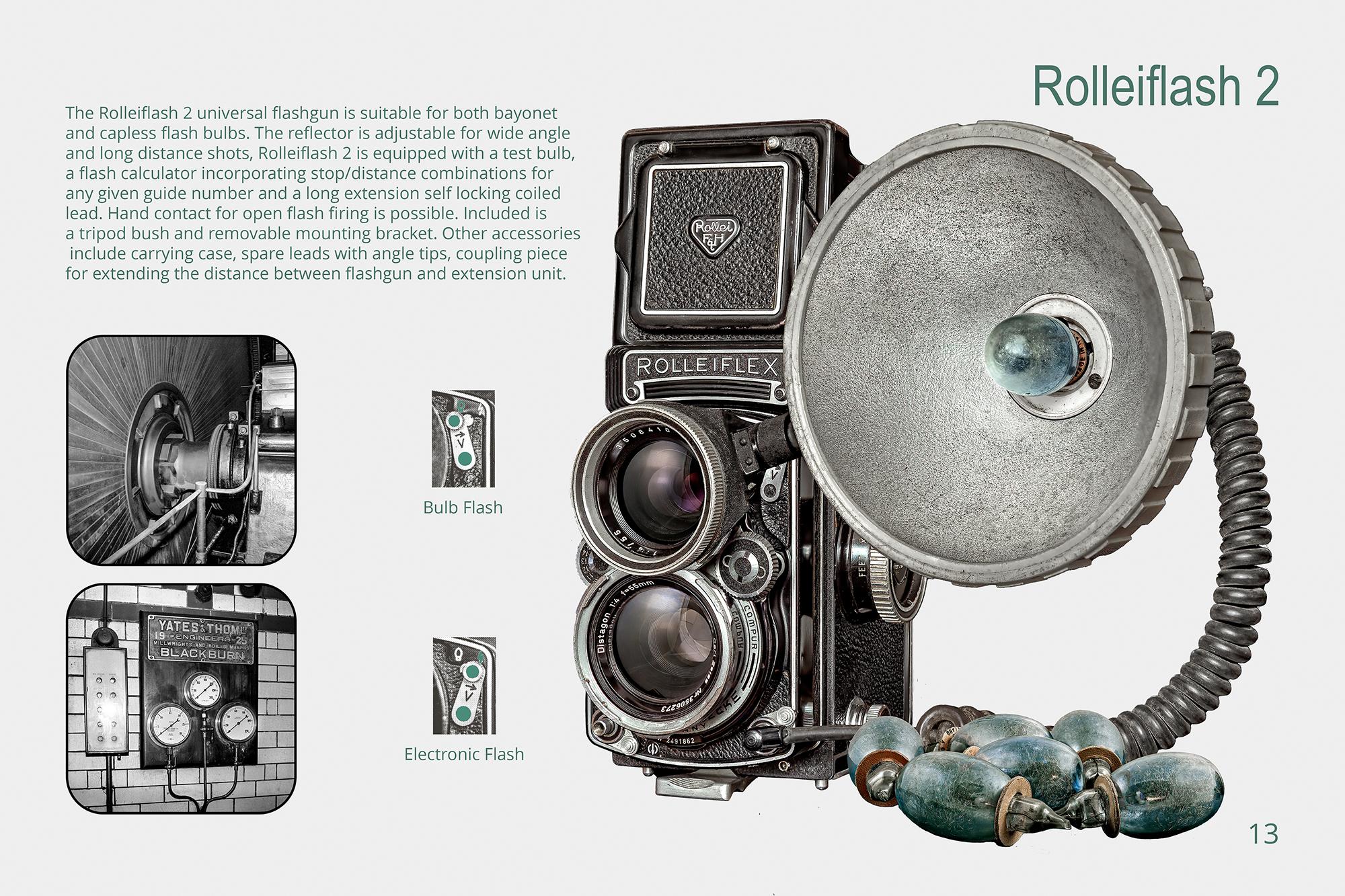 This was resolved with the inclusion of a twenty first page. Text, page numbers and titles within each page gave clarity to the purpose of each accessory. I added small thumbnails illustrating the function and operation of each component. These were generated from photographs coloured in green to emphasis the part and then screened. This followed the overall style of Rollei manuals and I felt an affinity to the original booklets would enhance the images.