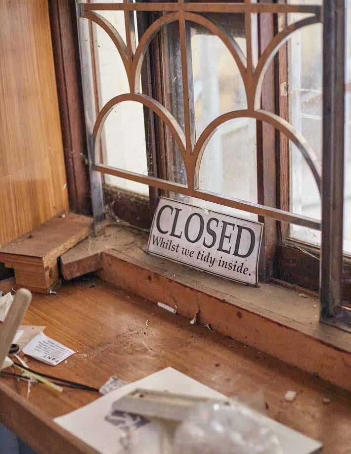 me was greatly appreciated, as the curatorial nature of my work dictated many hours of work. As well shooting the more obvious angles of the architecture, I was keen to capture the small details as well. The projector room and its equipment remained relatively untouched if not in decay, strips of 35mm film still hanging off the WESTREX (Western Electric) projector rollers and film cannisters. The offices were full of film memorabilia, posters and advertising campaigns in cupboards, many untouched as if the building had just been evacuated and never re-entered. Moving between rooms, often on scaffolding or temporary floors became a challenge in itself as I tried to navigate the debris and gaps. I shot mainly on digital with a prime 24mm lens, but also on 35mm film.