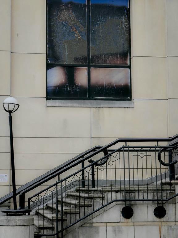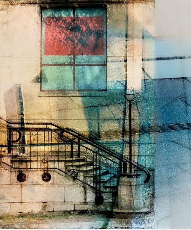 Then I moved across to the next iconic structure - the Water Tower where I spent time taking some in-camera multiple exposure images of the water distorted reflections and overlaying these with the lines of the pavement. It was one of these images that I chose to use as a background for my composite of the `stairs’ image of the entrance to the Queens Arcade in town.