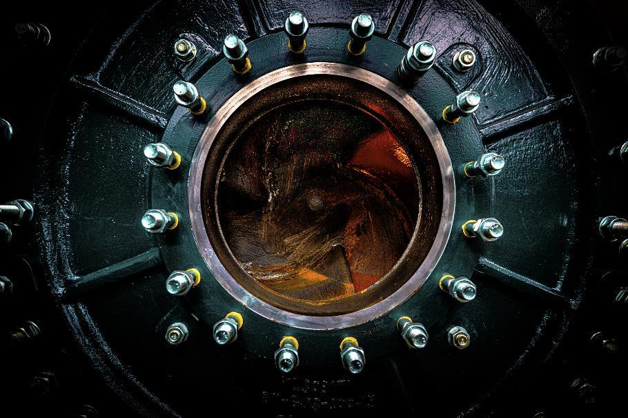 What does the viewer see? A glimpse into the hatch of a submarine? Working with illusions is one of the goals of my photography. The photos were originally taken at a company that manufactures pumps and show men at work and a view into a large pump.