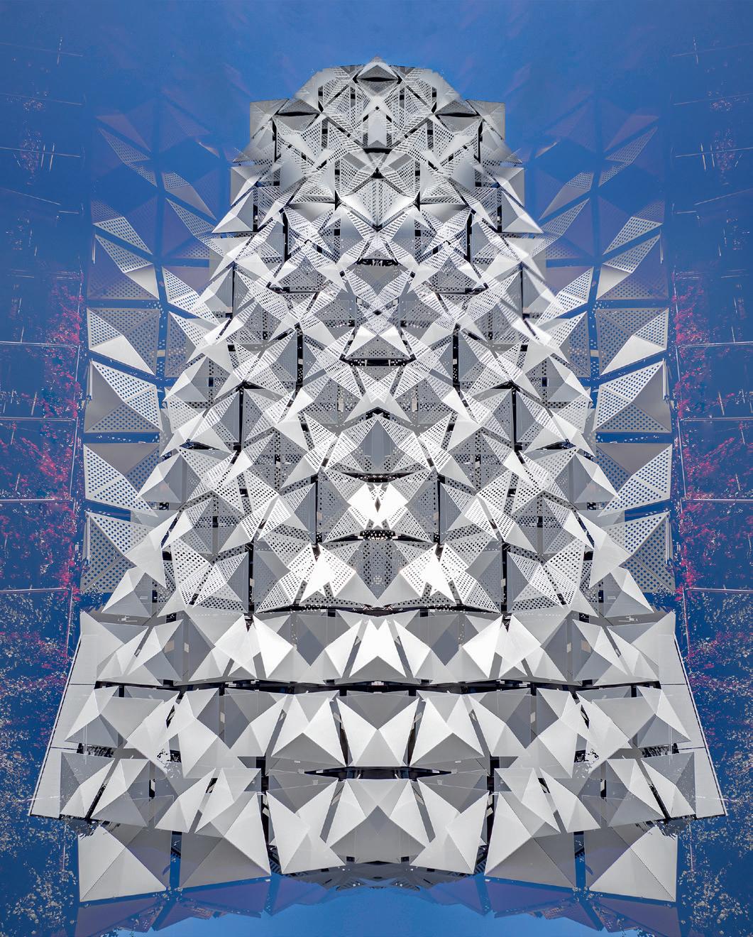 In the ‘seventies, architects resorted to Brutalist concrete panels to screen vehicles in multi-storey car parks. Not so now. There are many more options to choose from. This building is clad with asymmetrical four-sided pyramidal panels, pierced on three of the planes. It shimmers in the light, and I have tried to reflect that in my blended abstracted image.