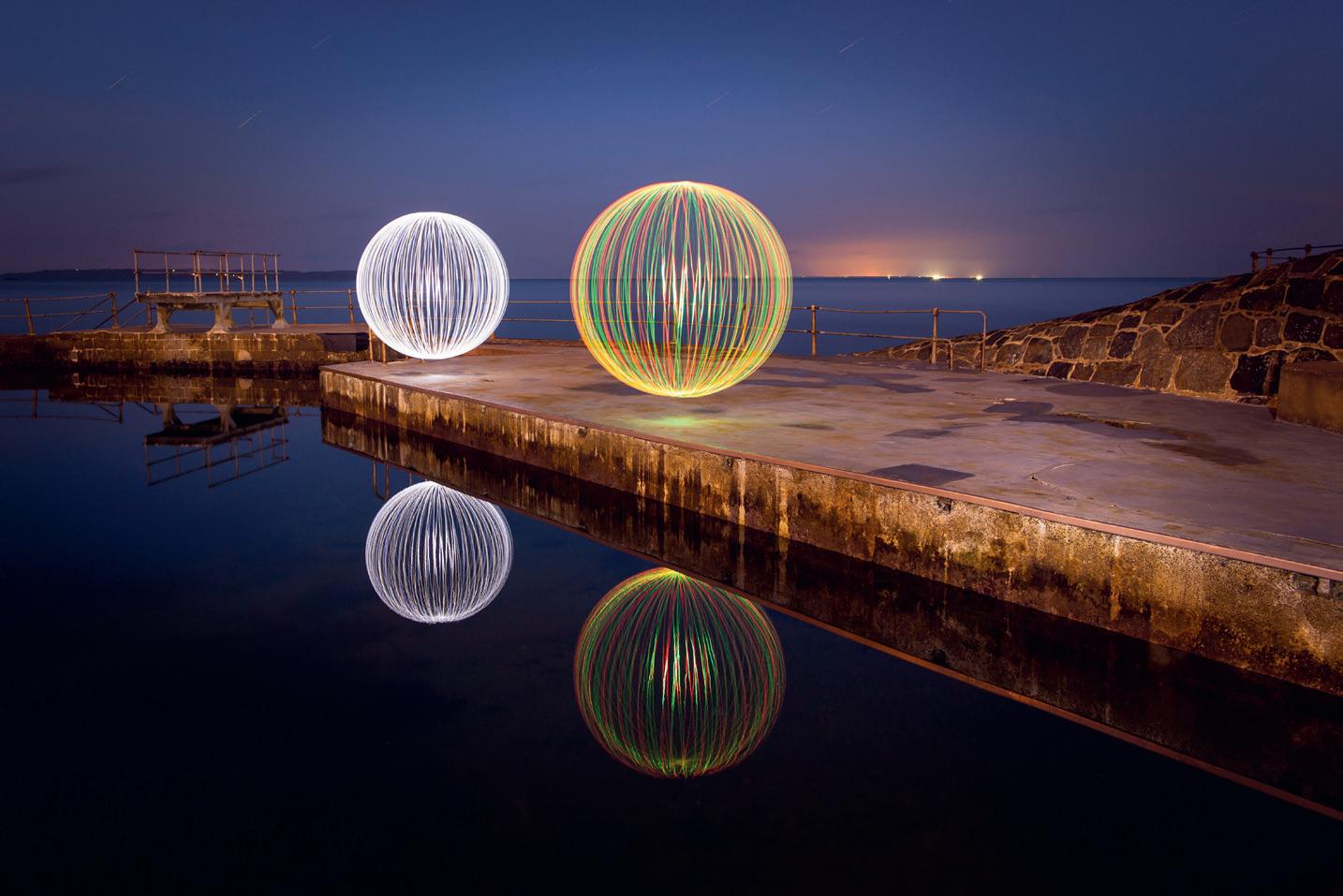 What makes these images so special is that they are all created using a very long exposure time and are created at night when it is very dark. The long exposure allows me time to walk into the shot while it is being photographed. I then move around portable light devices to create the colours and shapes frozen into each image. So long as I keep moving around during each exposure and avoiding illuminating myself, I remain invisible in the resulting photograph.