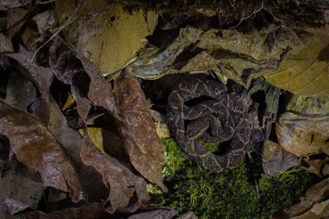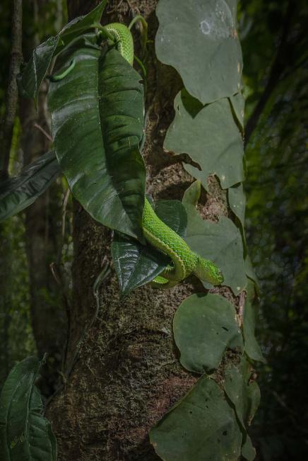 Golden eye-lash pit viper (previous page). I waded in a river to find the viper which is well camouflaged on top of the flower. I was wary of getting too close as they are quite venomous, this meant I had to crop the image to get the look I wanted.