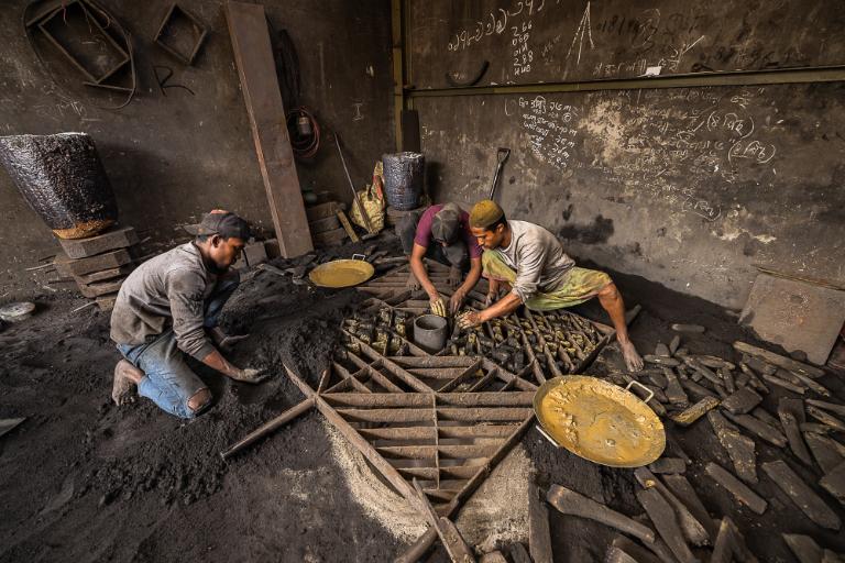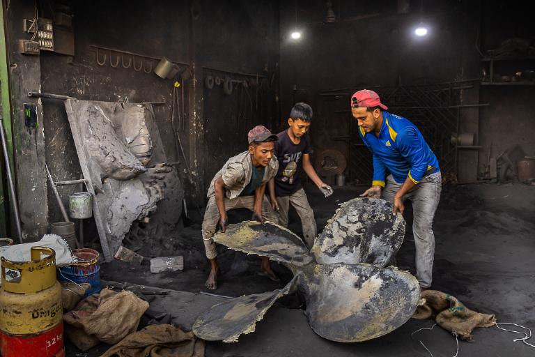 We had seen and photographed the lad in the white shirt (above) since he was a small boy collecting scraps of metal. Now he is working and taking on an important role in the manufacturing process.