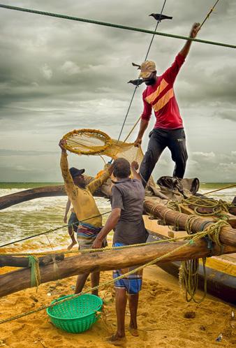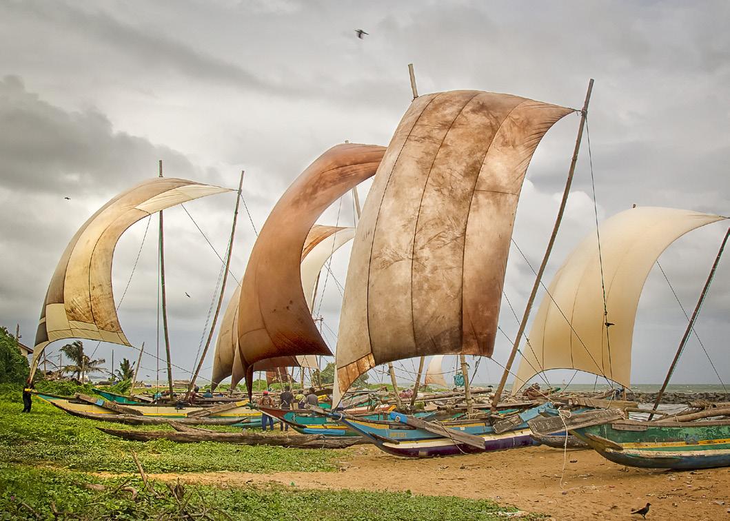 The centre of Colombo has a lot of interesting old buildings, though many have seen better days. The nearby Pettah area was chaotic, with its narrow streets full of business activity. We returned here as a group early the next day, to the market streets on the east side. So much was being done with manual labour, shifting enormous loads of fruit, vegetables and grain. Everyone was very friendly, and virtually everyone was happy to be photographed. If you are a little fearful of photographing people, Sri Lanka (like inland Bali) is a great place to start. After visiting a Hindu temple and a Buddhist one in the afternoon, then dining after sunset, we got back to our hotel, where there was a wedding reception happening in the rooftop banquet hall, which happened to be on the ceiling of my room. Not liking the prospect of doof-doof music sending me to sleep, I swapped rooms. Up seriously early the next morning, we headed off to Negombo, a fishing village north of Colombo. The sailing boats and other boats were coming in with their catches, so there were