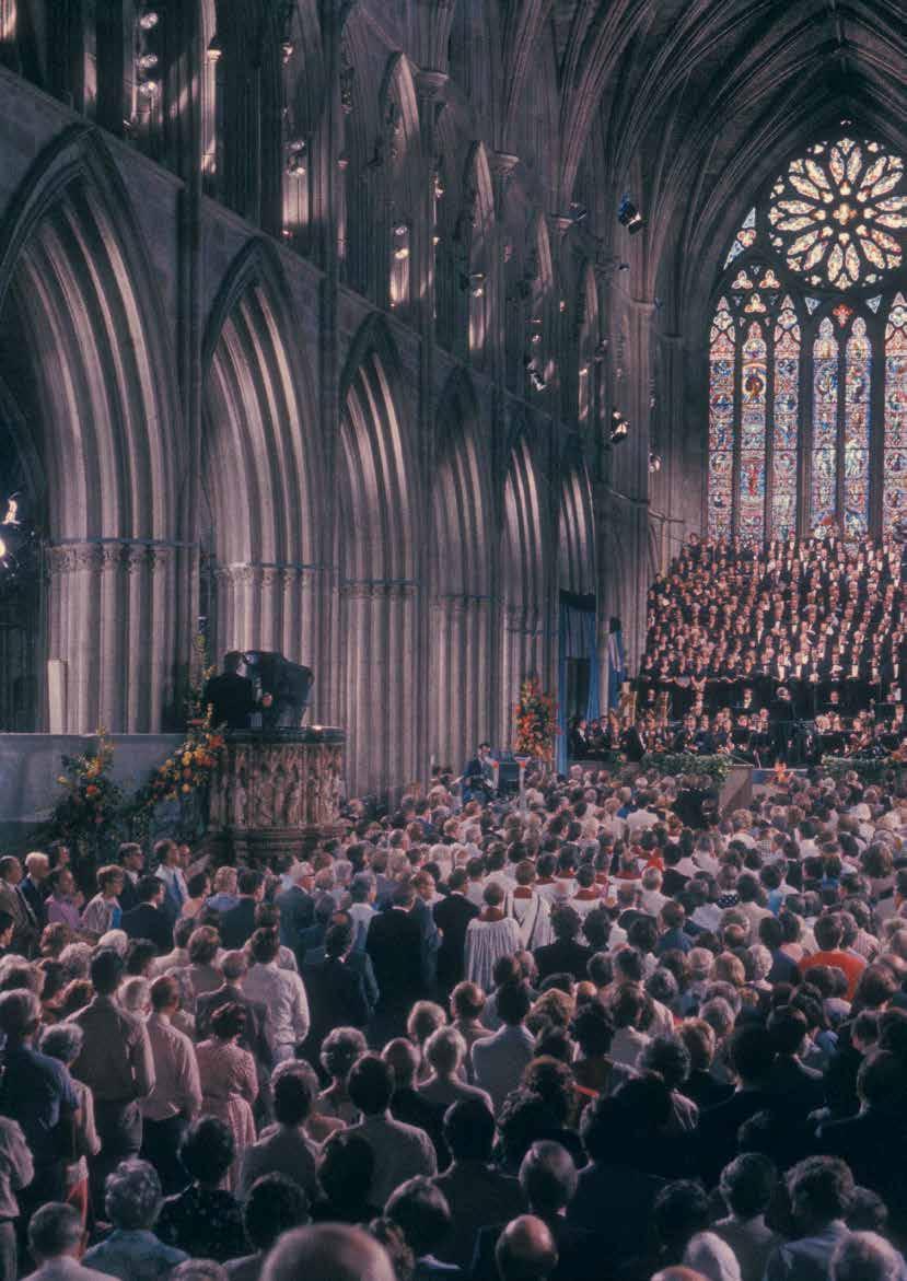 Three Choirs Festival at Worcester Cathedral 1984 opening service of thanksgiving with choir, orchestra, BBC filming and congregation.