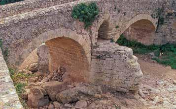The bridge has an interesting construction in that as well as being low-sided in order to allow pack-laden horses to walk across with ease, there are also triangular alcoves at regular intervals. The alcoves allowed people to stand aside in order to let the horses pass unimpeded and themselves to remain uninjured from collision.
