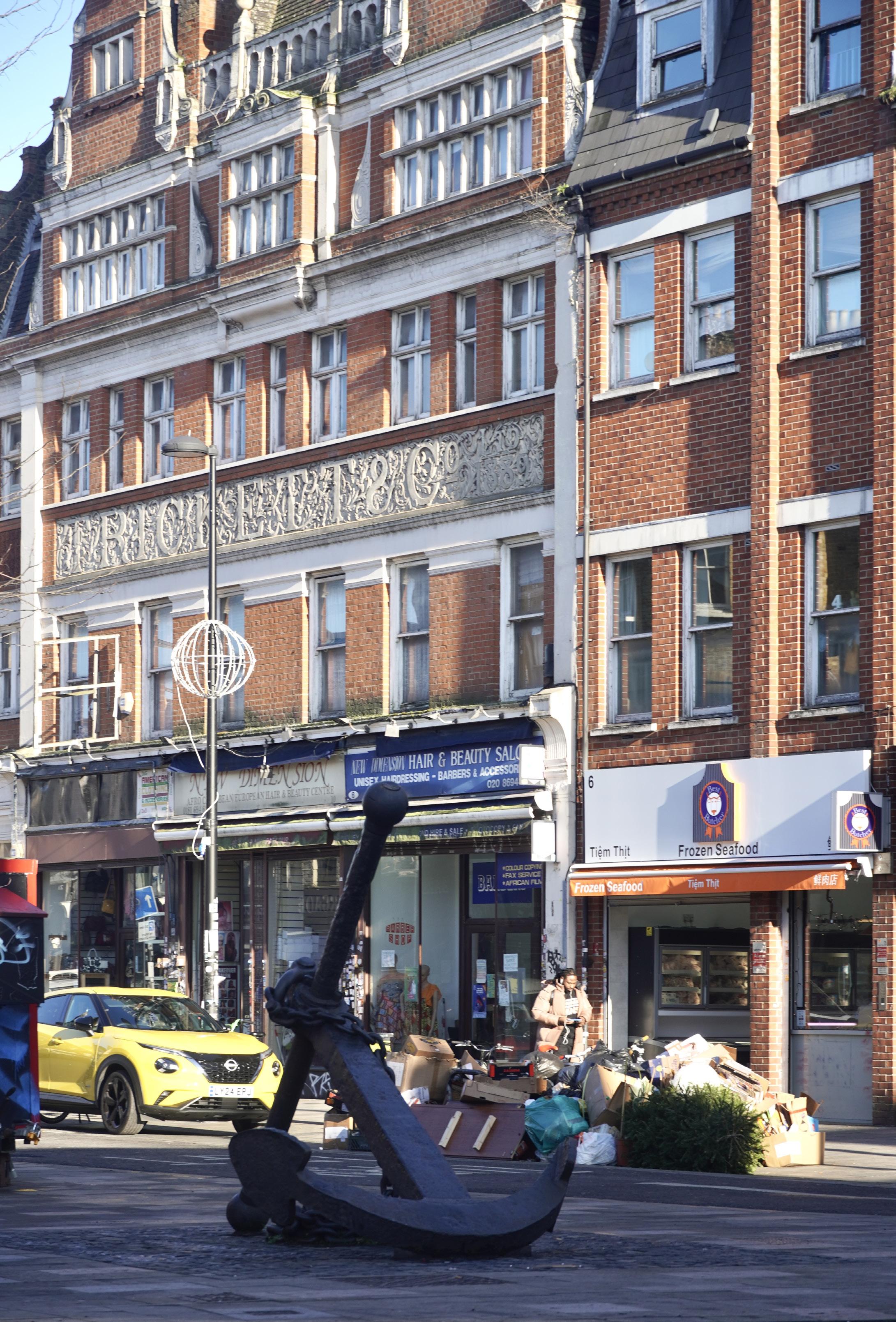 Following this composite map, I made my way to the far end of Deptford High Street, where the Deptford Anchor, a sculptural landmark mentioned in several route guides, stood in place. The hulking maritime relic sat at the centre of the bustling market street: solid, grounded, and unmistakable.