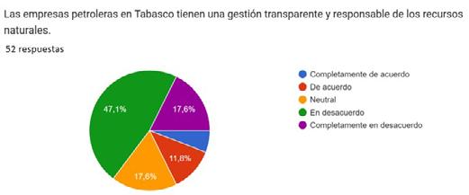 La opinión negativa o neutral podría reflejar preocupaciones sobre el impacto ambiental, la falta de desarrollo sostenible, o la insuficiencia de programas de responsabilidad social que realmente beneficien a las comunidades locales. También podría indicar que los beneficios percibidos no están distribuidos equitativamente, aunque hay una percepción mayoritaria positiva sobre el impacto económico de las empresas petroleras en Tabasco, existe una minoría significativa que cuestiona este impacto o no lo percibe de manera tan clara. Esto resalta la importancia de que las empresas y las autoridades trabajen en una comunicación más efectiva y en la implementación de iniciativas que aborden tanto los beneficios económicos como las preocupaciones ambientales y sociales.