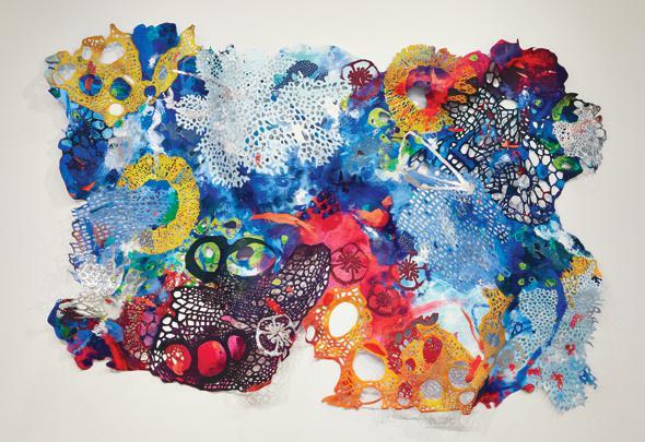 Canvas, dye, paint, pastel, stitching, embroidery and foil