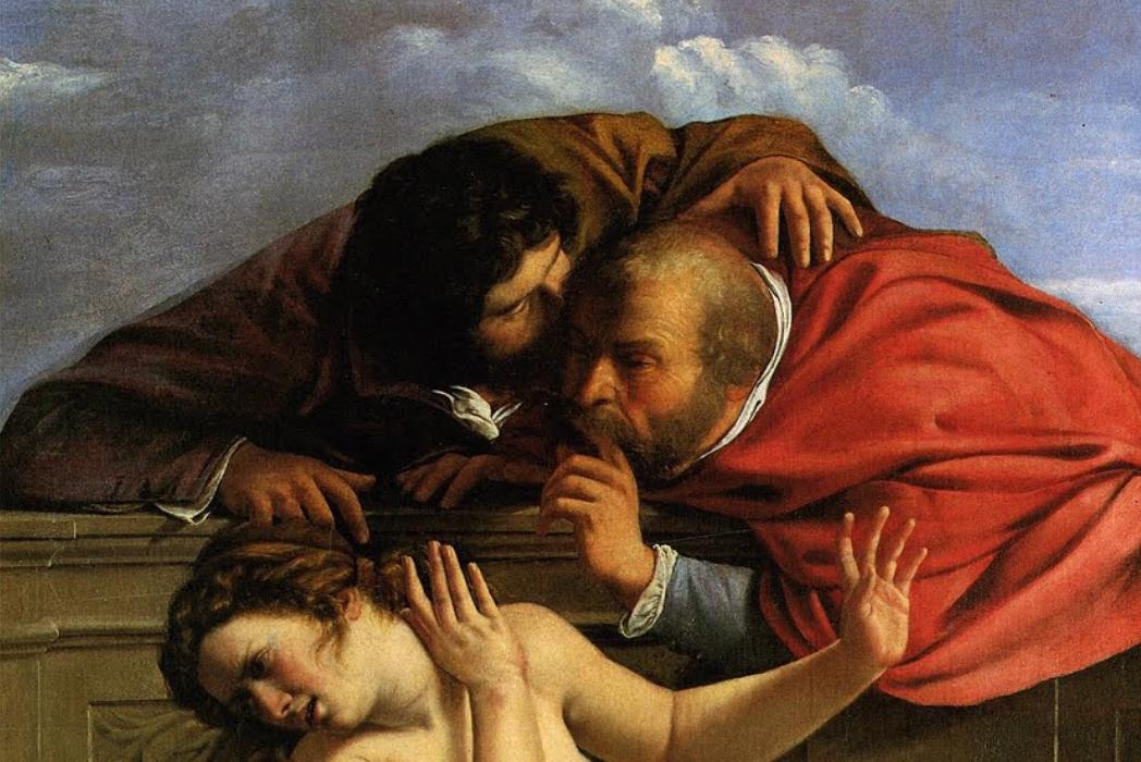 Two paintings, both titled Susanna and the Elders, voice Gentileschi’s strong campaign for women’s sexual rights. They respond to the Old Testament story of a woman (Susanna) who is spied on and approached by two men (the Elders) whilst bathing in her garden. After she refuses their sexual advances, the Elders accuse her of adultery. Previously objectifying and villainizing portrayals of Susanna by male artists, such as Cesari Giuseppe or Otavio Leonni, arrange Susanna’s nude body for the pleasure of the viewers. She nonchalantly brushes her hair or washes herself in a nearby pond whilst staring seductively from the canvas at the target—male—audience. Her unaffected behaviour in the Elders presence insinuates that she is the villain in this story, responsible for leading the Elders on, which leads to her trial.