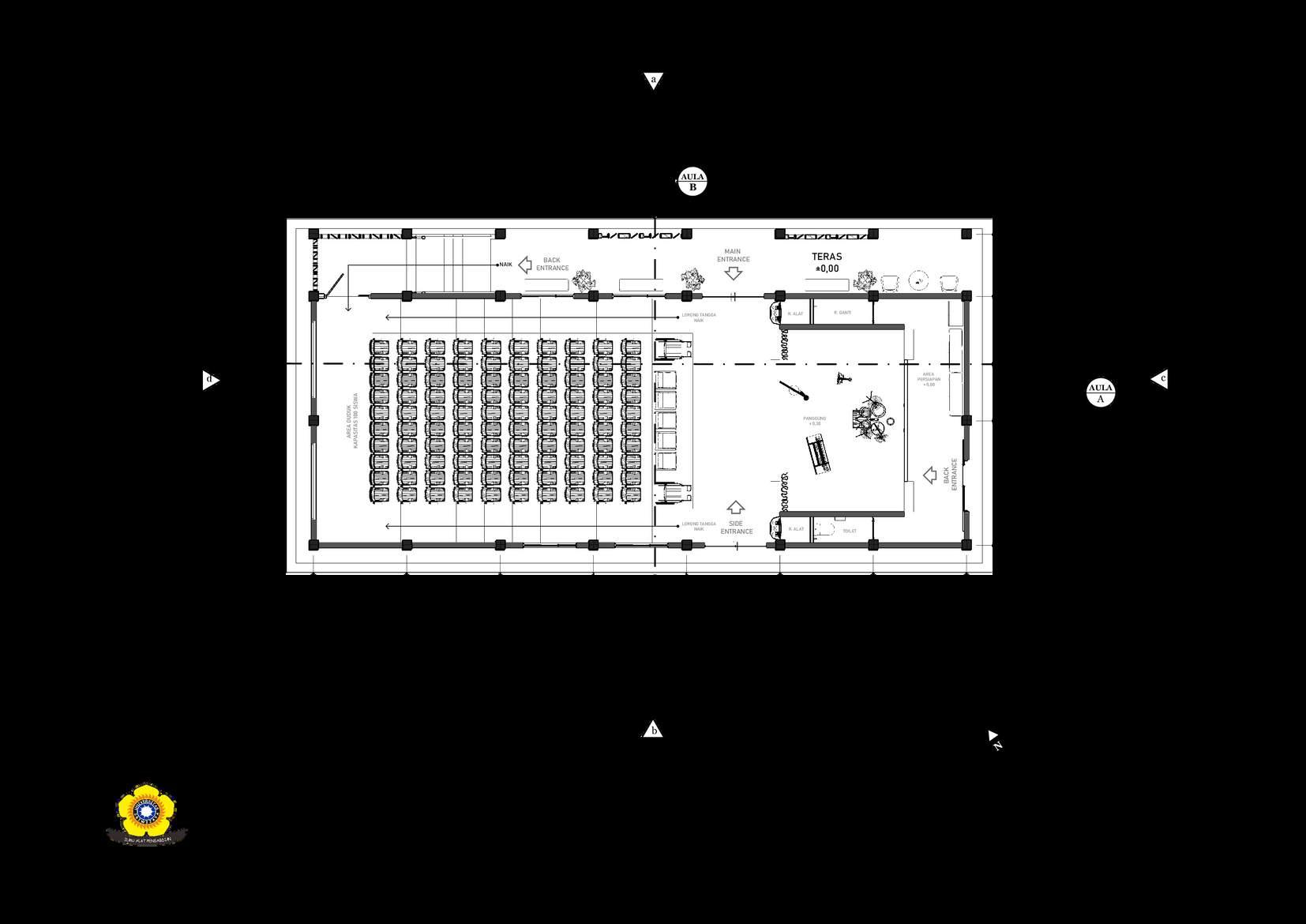 Aula / Auditorium kedap suara dan cahaya yang bisa menampung ± 100 peserta didik untuk penggelaran seni teater, band musik, dan film sekolah. Tempat duduk disusun bertingkat dengan warna merah untuk menciptakan suasana seperti di bioskop. Aula ini juga dilengkapi back stage dan toilet ganti pakaian Teknologi aula dilengkapi lampu sorot, pengeras suara dan gudang kecil untuk menyimpan kursi cadangan di bawah struktur kursi bertingkat.