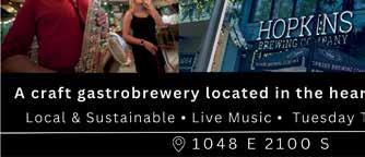 –1048 E. 2100 South, SLC, 385-528-3275. hopkinsbrewingcompany.com. If you like craft beer served with a focus on sustainability, “The Hop” could be your new favorite watering hole. The vibe fits the Sugar House scene with frequent live music.