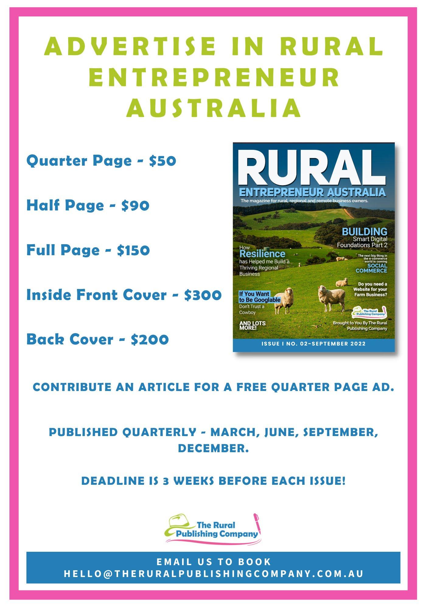 GRAB THIS SPACE TO PROMOTE YOUR BUSINESS - EMAIL hello@theruralpublishingcompany. com.au 72 | Rural Entrepreneur Australia