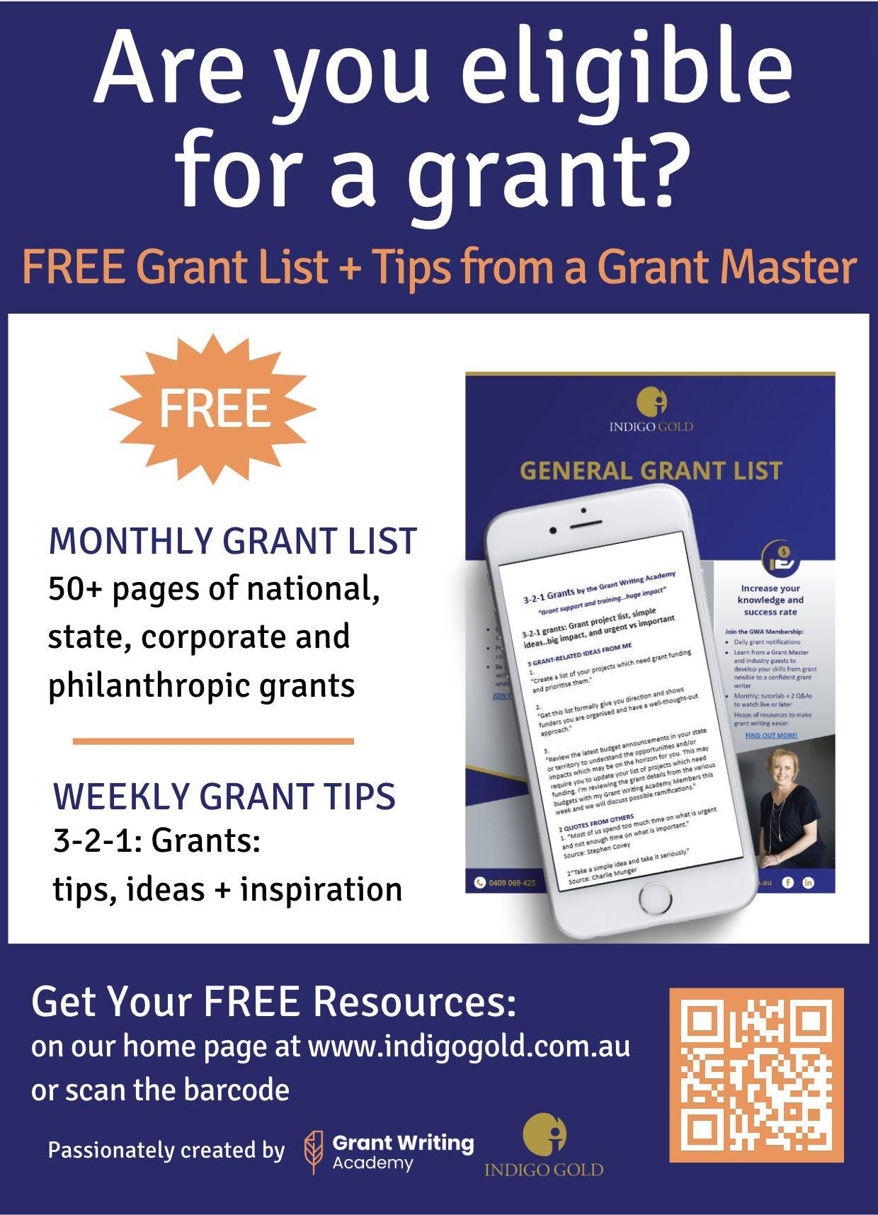 Remember there are heaps more grants in the free monthly General Grant List! Sign up for it here: www.indigogold.com.au