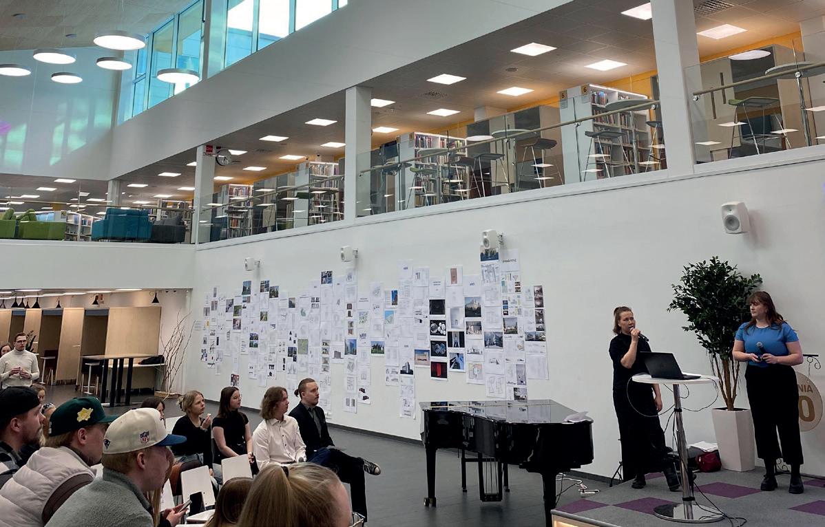 Matineassa kuultiin myös kansainvälisessä Neptune-projektissa työskennelleiden opiskelijoiden Riina Salon ja Ronja Aholan kuulumiset. Projektin työaiheet ovat joka vuosi yllättäviä ja haastavia ja ehkä juuri siksi niin mieleenpainuvia kokemuksia. Kampussydämen suuren seinän peitti opiskelijatöistä koottu näyttely, jonka satoa esitellään tämän julkaisun sivuilla.