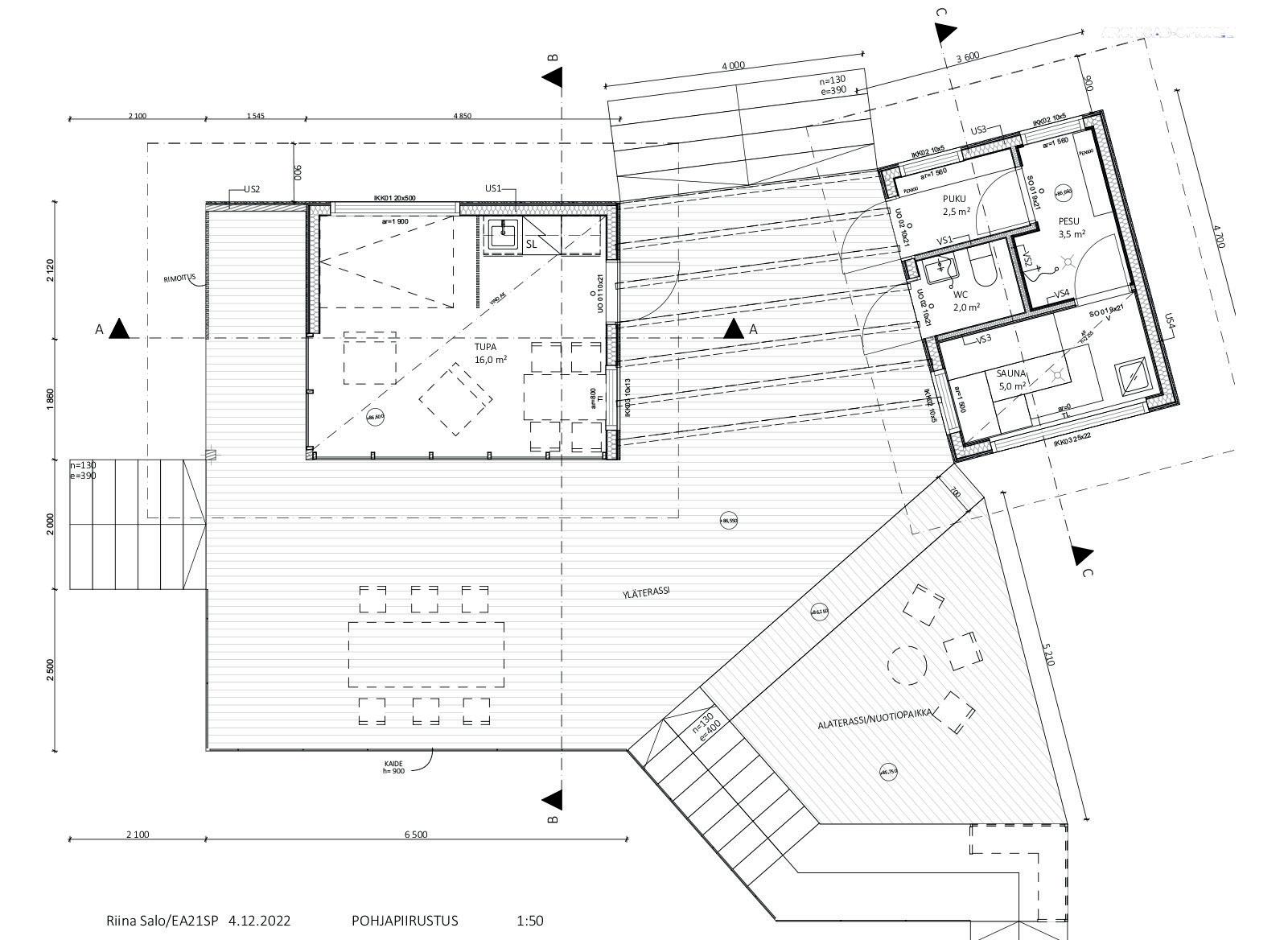 Tehtävänä oli suunnitella rantaan sijoittuva vapaa-ajan rakennus neljälle hengelle. Suunnittelutehtävään annettiin valmiiksi määritelty tilaohjelma, joka käsitti mm. puulämmitteisen saunan, saunatuvan ja osittain katetun terassin. Harjoitustyössä opeteltiin rakennuksen sijoittamista annettuun rakennuspaikkaan sekä tilojen mitoitusta, kalustettavuutta ja toimivuutta.