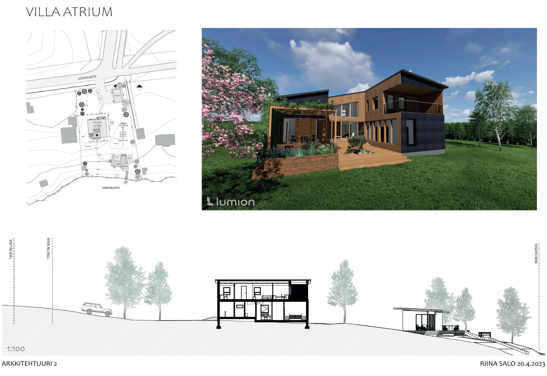 Harjoitustyötä tehtiin ohjatusti ja itsenäisesti useassa vaiheissa alustavista tavoitteista ja luonnoksista pääpiirustuksiin. Lopputuloksena syntyi pääpiirustustasoiset asemapiirustus, pohjapiirustus, leikkauspiirustukset ja julkisivupiirustukset sekä havainnekuvia.