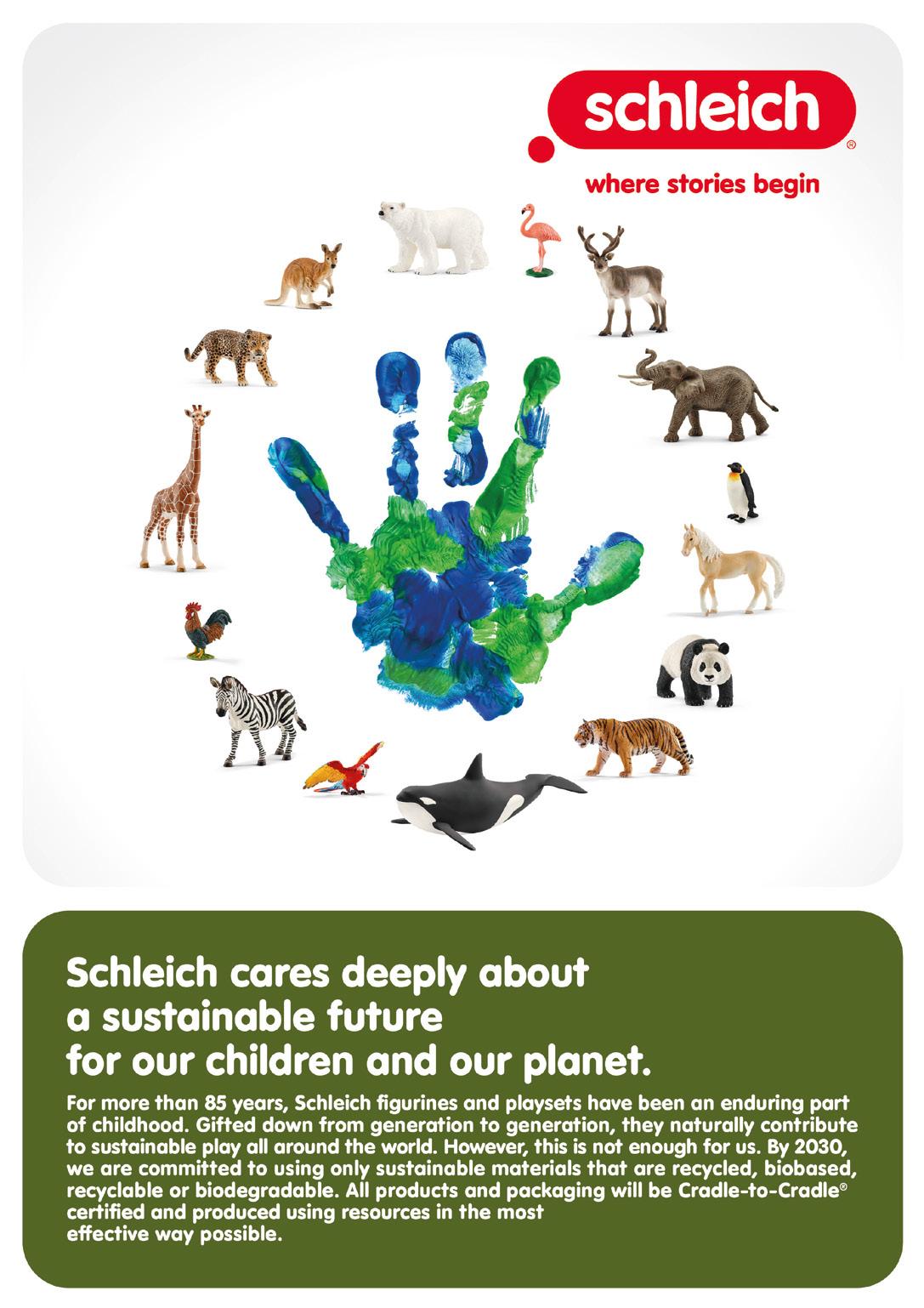 The toy manufacturer Schleich has set itself the goal of producing its toys in a more sustainable way. “We strive to use only sustainable materials. As a first step, by the end of 2027 all our figurines will be recyclable or biodegradable. Also, we are working hard at finding recycled or bio-based material for the future production of our toys”, explains Schleich CEO Dirk Engehausen. In addition to that and to ensure resources are reused over and over again, Schleich is optimizing and certifying its products and packaging in accordance with the Cradle to Cradle® circular economy principles by the end of 2027. This means, among other factors, that Schleich figurines are recycled without loss of material quality. The first measurable successes are already visible in the reduction of plastics in packaging. The holistic sustainability strategy also focuses on getting children excited about nature and animals through free play.