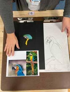 an idea and searched for inspirational images online, then they drew their vision and made a composition out of it. They put the object (in this case a parrot) into a space, put a border around it, and figured out the spatial relationship of the image inside of a border. Then, they cut paper collage to make a mosaic.