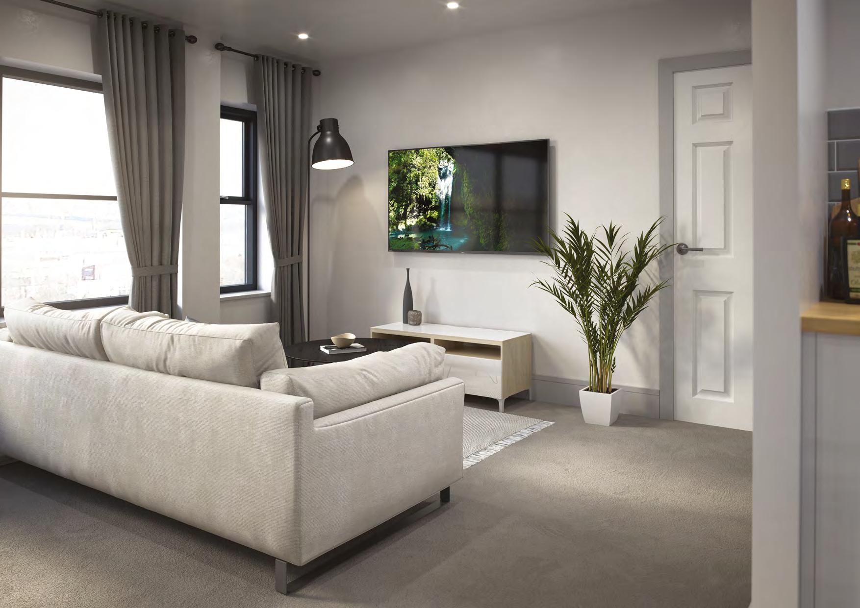 Living rooms at Grosvenor feature a chic wash of white and princess grey, giving the room a fresh and calming feel.