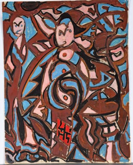 Nude Couple. Signed (Illegible). Oil on canvas. Homemade repair lower middle. Crazing and minor paint loss, otherwise fair condition. 20" w x 30" h.