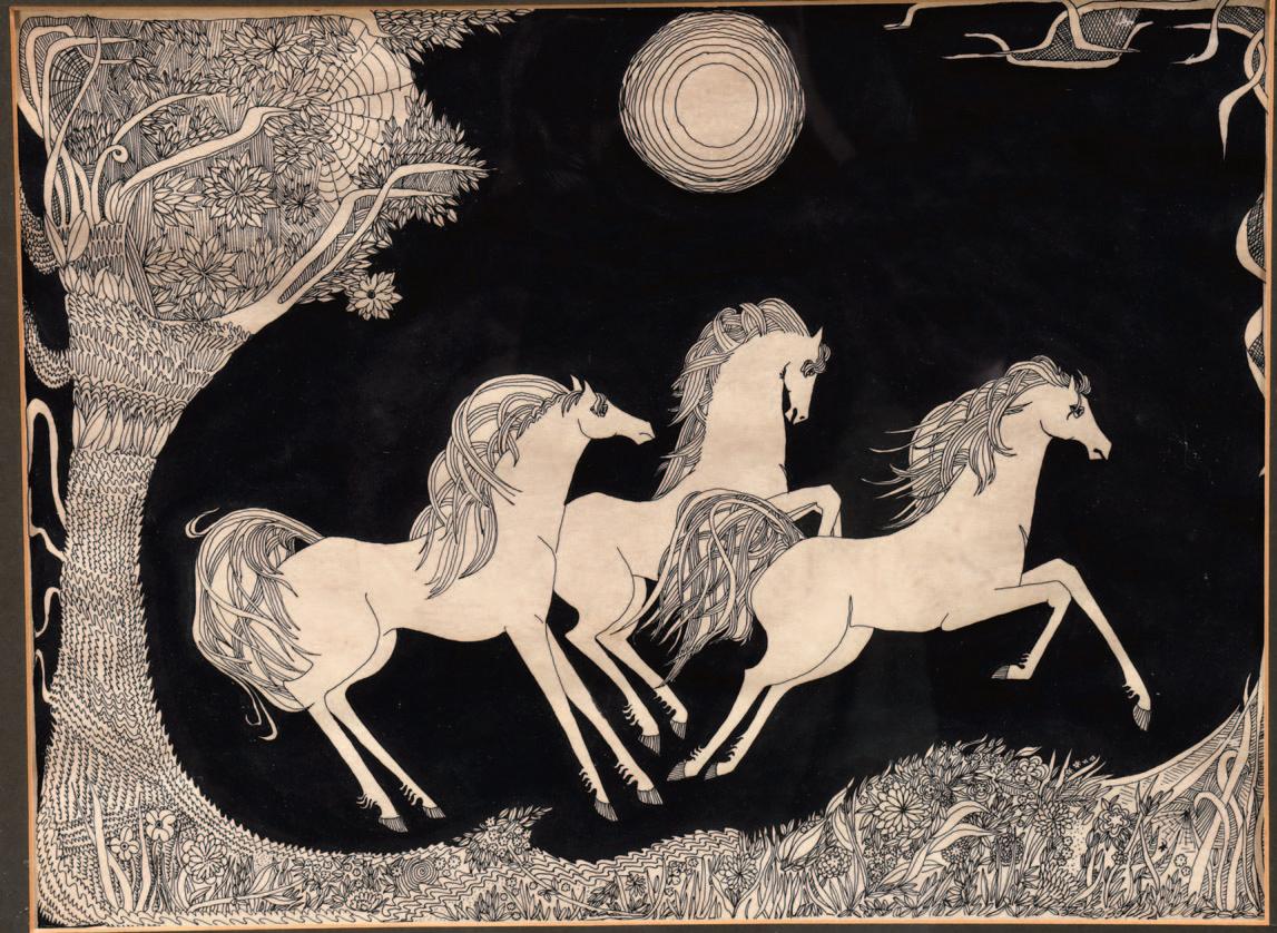 853. Unknown Artist. Three Horses. Ink on paper. Excellent condition.