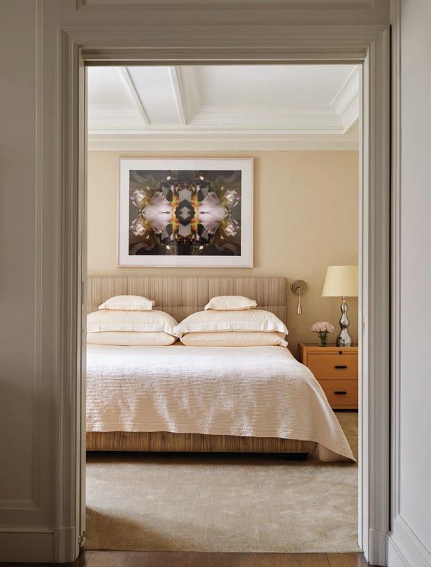 Bethany acquired the vintage rug at auction a year before they began work on the space. “I knew it was a one-in-a lifetime match with the wallpaper and they'd love it,” said Bethany. The persimmoncolored velvet drapery extends to the dining room, situated across the spacious foyer, which features a classic black-and-white tiled marble floor and a lacquered plaster ceiling executed by Classic Finishes.