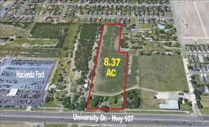 3406 W. UNIVERSITY, EDINBURG 8.37 acres located in a fast-growing market area w/ excellent visibility. Front age on Hwy 107 near retail, medical, auto dealerships, and roof tops. Potential uses may include: residential, commercial, multi-family, auto dealership, mixed use, or storage units. No value to house. $1,895,000. Call Charles 956-682-3000. WEB#:587259