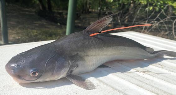 How do you know if you caught a tagged catfish? There will be an orange dart tag affixed to the fish. This tag has a unique number and a mailing address to return the tag.