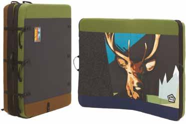 diverse dimensioni per soddisfare le esigenze di ogni boulderista, e il Reggae, caratterizzato dalla chiusura a taco. Alla proposta si aggiungono anche due additional padil Groove e il Break - ideali per partenze da seduti. La cover in ogni modello è realizzata con tessuto Cordura, che garantisce robustezza, 100% impermeabilità e resistenza alle abrasioni. L'assorbimento agli impatti è garantito da strati di schiuma di alta qualità, ogni pad è dotato di zerbino integrato, ideale per la pulizia delle scarpette. Il tessuto gommato sul fondo assicura un'ottima aderenza al terreno, riducendo al minimo il rischio di scivolamenti durante l'utilizzo su pendii scoscesi. I ganci per le chiusure sono in alluminio aeronautico leggero e resistente. L'unicità di questi nuovi prodotti è rappresentata dall'essere delle piccole opere d'arte. Le quattro fantasie - il cervo, gli insetti, le felci e le foglie - e i colori proposti, sono stati appositamente pensati per essere in armonia con la natura e l'ambiente circostante, aggiungendo un tocco di bellezza e originalità a ogni sessione di arrampicata.