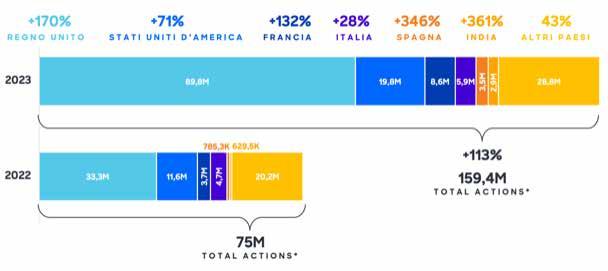 Fonte: Comscore | Sharebalee, contenuti che menzionano "Wimbledon" su Facebook, Instagram, Twitter e TikTok. Paesi: Global, US*all, UK*all, FR*all, ES*all, IT*all e IN*all. Periodi di analisi: 20 giugno - 10 luglio 2022 e 26 giugno - 16 luglio 2023.